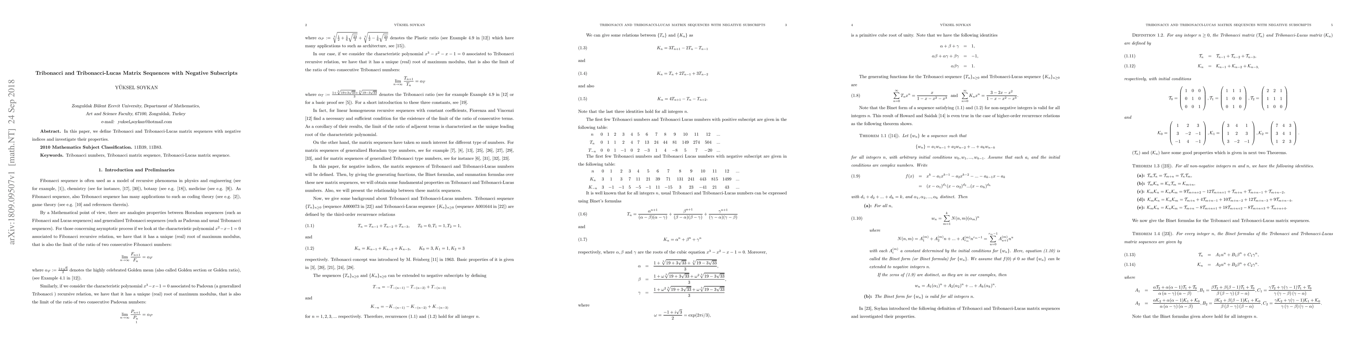 This paper defines Tribonacci and Tribonacci-Lucas matrix sequences extending to negative indices and explores the mathematical properties and behaviors of these sequences in this new context.