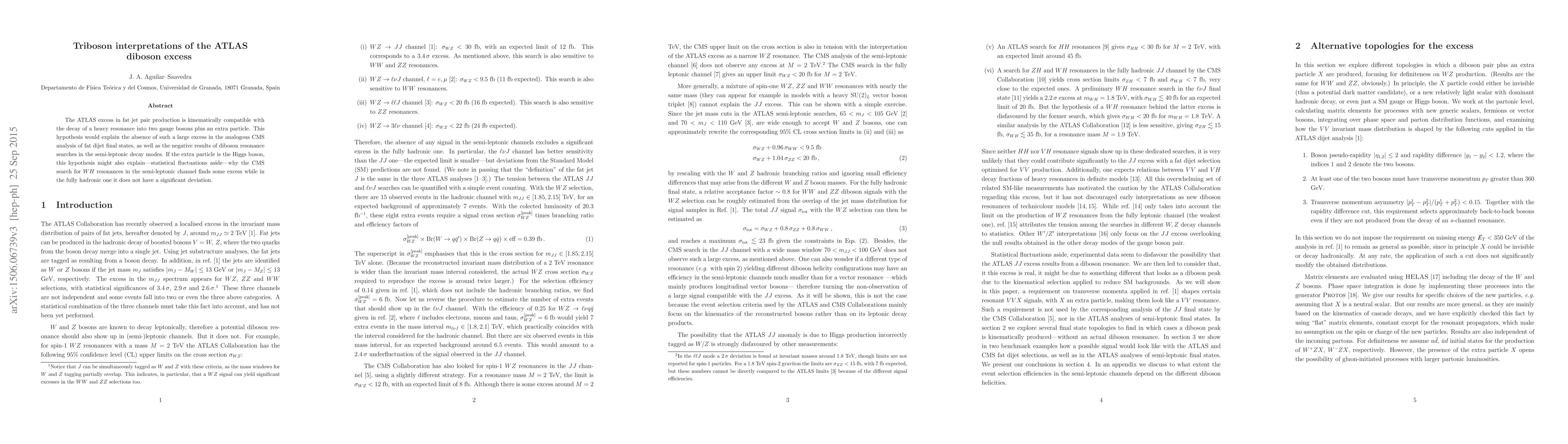 The ATLAS experiment observes a diboson excess in fat jet pair production potentially indicating a heavy resonance decaying into two gauge bosons plus an extra particle, which could be the Higgs boson. This hypothesis explains discrepancies in CMS analyses and diboson searches, suggesting different outcomes in semi-leptonic versus fully hadronic channels.