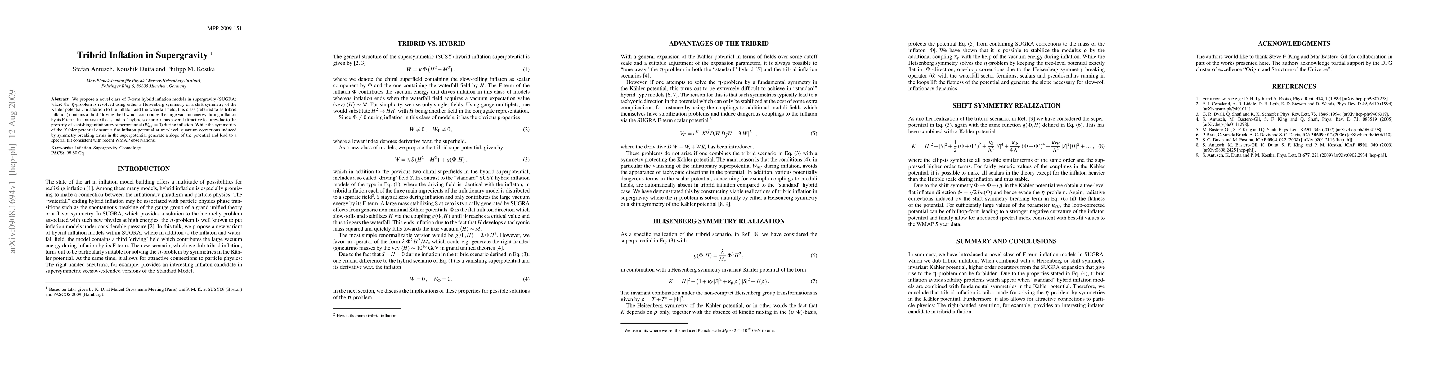 This paper introduces a new type of F-term hybrid inflation model in supergravity, termed tribrid inflation, which resolves the $\eta$-problem via Heisenberg or shift symmetries. It features a third 'driving' field contributing to inflation's vacuum energy, offering advantages like a vanishing inflationary superpotential and a potential slope consistent with WMAP observations.