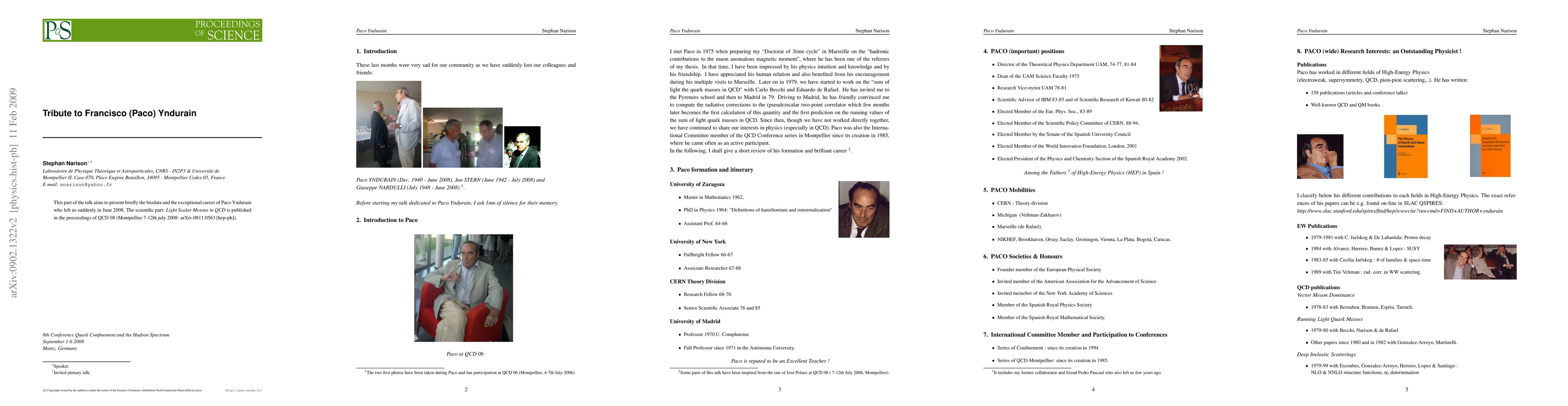 This part of the talk aims to present briefly the biodata and the exceptional career of Paco Yndurain who left us suddenly in June 2008. The scientific part: Light Scalar Mesons in QCD is published in the proceedings of QCD 08 (Montpellier 7-12th july 2008: arXiv:0811.0563 [hep-ph]).