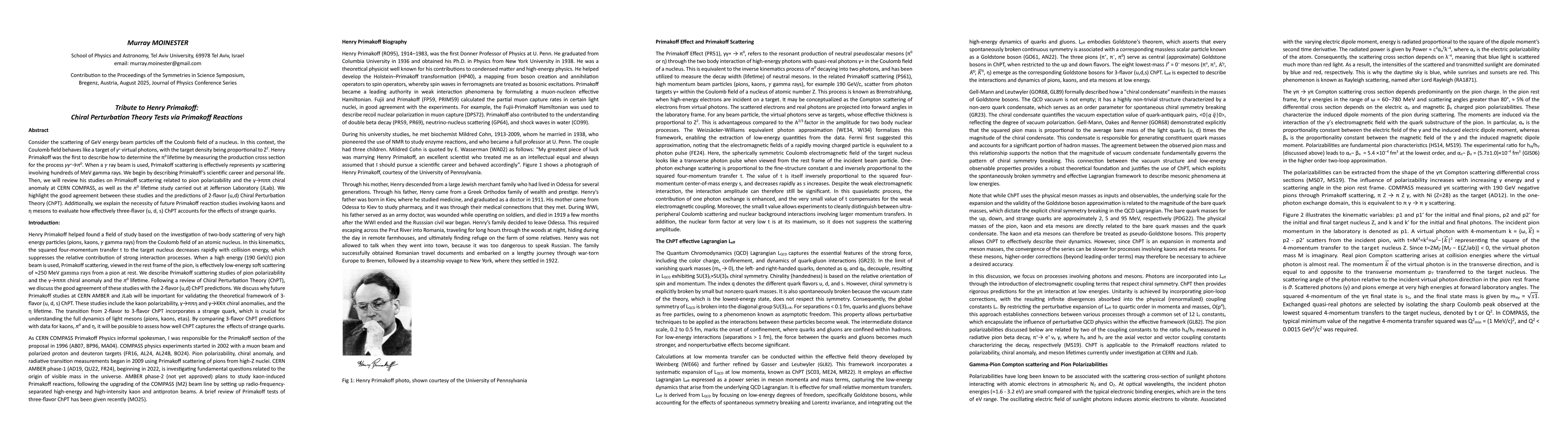 Consider the scattering of GeV energy beam particles off the Coulomb field of a nucleus. In this context, the Coulomb field behaves like a target of $\gamma^*$ virtual photons, with the target density being proportional to Z$^2$. Henry Primakoff was the first to describe how to determine the $\pi^0$ lifetime by measuring the production cross section for the process $\gamma\gamma^* \rightarrow \pi^0$. When a $\gamma$ ray beam is used, Primakoff scattering is effectively represents $\gamma\gamma^*$ scattering involving hundreds of MeV gamma rays. We begin by describing Primakoffs scientific career and personal life. Then, we will review his studies on Primakoff scattering related to pion polarizability and the $\gamma\rightarrow\pi\pi\pi$ chiral anomaly at CERN COMPASS, as well as the $\pi^0$ lifetime study carried out at Jefferson Laboratory (JLab). We highlight the good agreement between these studies and the predictions of 2-flavor (u,d) Chiral Perturbation Theory (ChPT). Additionally, we explain the necessity of future Primakoff reaction studies involving kaons and $\eta$ mesons to evaluate how effectively three-flavor (u, d, s) ChPT accounts for the effects of strange quarks.