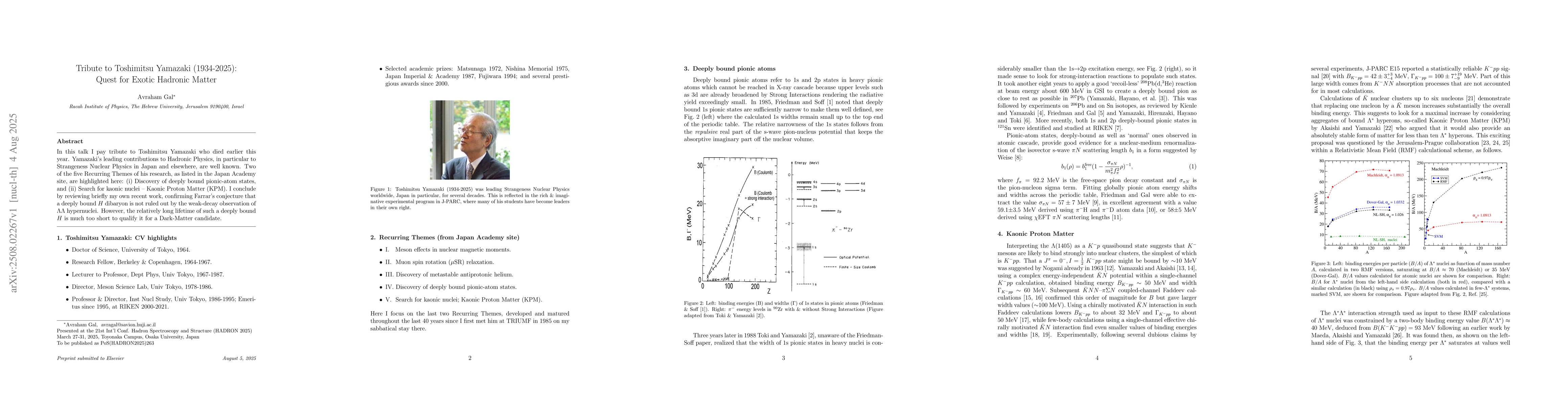 In this talk I pay tribute to Toshimitsu Yamazaki who died earlier this year. Yamazaki's leading contributions to Hadronic Physics, in particular to Strangeness Nuclear Physics in Japan and elsewhere, are well known. Two of the five Recurring Themes of his research, as listed in the Japan Academy site, are highlighted here: (i) Discovery of deeply bound pionic-atom states, and (ii) Search for kaonic nuclei -- Kaonic Proton Matter (KPM). I conclude by reviewing briefly my own recent work, confirming Farrar's conjecture that a deeply bound $H$ dibaryon is not ruled out by the weak-decay observation of $\Lambda\Lambda$ hypernuclei. However, the relatively long lifetime of such a deeply bound $H$ is much too short to qualify it for a Dark-Matter candidate.