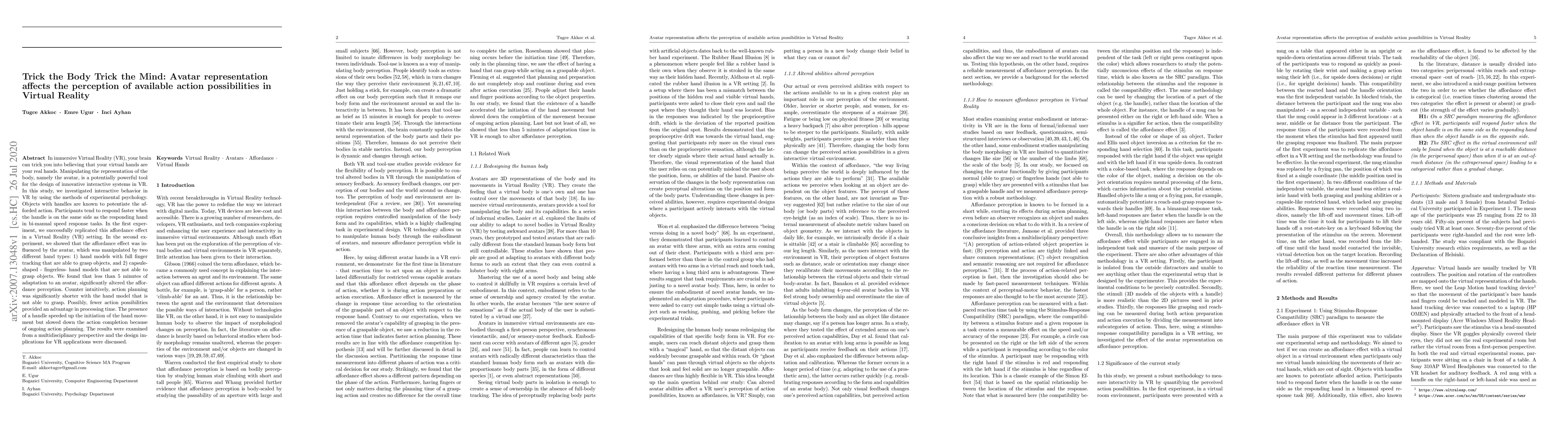 In immersive Virtual Reality (VR), your brain can trick you into believing that your virtual hands are your real hands. Manipulating the representation of the body, namely the avatar, is a potentially powerful tool for the design of innovative interactive systems in VR. In this study, we investigated interactive behavior in VR by using the methods of experimental psychology. Objects with handles are known to potentiate the afforded action. Participants tend to respond faster when the handle is on the same side as the responding hand in bi-manual speed response tasks. In the first experiment, we successfully replicated this affordance effect in a Virtual Reality (VR) setting. In the second experiment, we showed that the affordance effect was influenced by the avatar, which was manipulated by two different hand types: 1) hand models with full finger tracking that are able to grasp objects, and 2) capsule-shaped -- fingerless -- hand models that are not able to grasp objects. We found that less than 5 minutes of adaptation to an avatar, significantly altered the affordance perception. Counter intuitively, action planning was significantly shorter with the hand model that is not able to grasp. Possibly, fewer action possibilities provided an advantage in processing time. The presence of a handle speeded up the initiation of the hand movement but slowed down the action completion because of ongoing action planning. The results were examined from a multidisciplinary perspective and the design implications for VR applications were discussed.