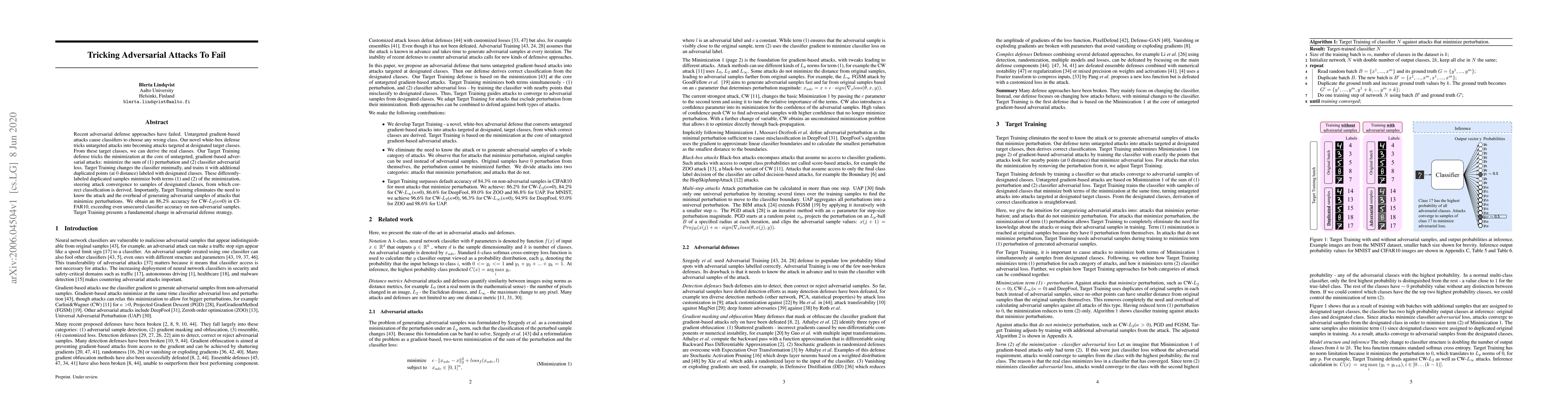 Recent adversarial defense approaches have failed. Untargeted gradient-based attacks cause classifiers to choose any wrong class. Our novel white-box defense tricks untargeted attacks into becoming attacks targeted at designated target classes. From these target classes, we can derive the real classes. Our Target Training defense tricks the minimization at the core of untargeted, gradient-based adversarial attacks: minimize the sum of (1) perturbation and (2) classifier adversarial loss. Target Training changes the classifier minimally, and trains it with additional duplicated points (at 0 distance) labeled with designated classes. These differently-labeled duplicated samples minimize both terms (1) and (2) of the minimization, steering attack convergence to samples of designated classes, from which correct classification is derived. Importantly, Target Training eliminates the need to know the attack and the overhead of generating adversarial samples of attacks that minimize perturbations. We obtain an 86.2% accuracy for CW-L2 (confidence=0) in CIFAR10, exceeding even unsecured classifier accuracy on non-adversarial samples. Target Training presents a fundamental change in adversarial defense strategy.