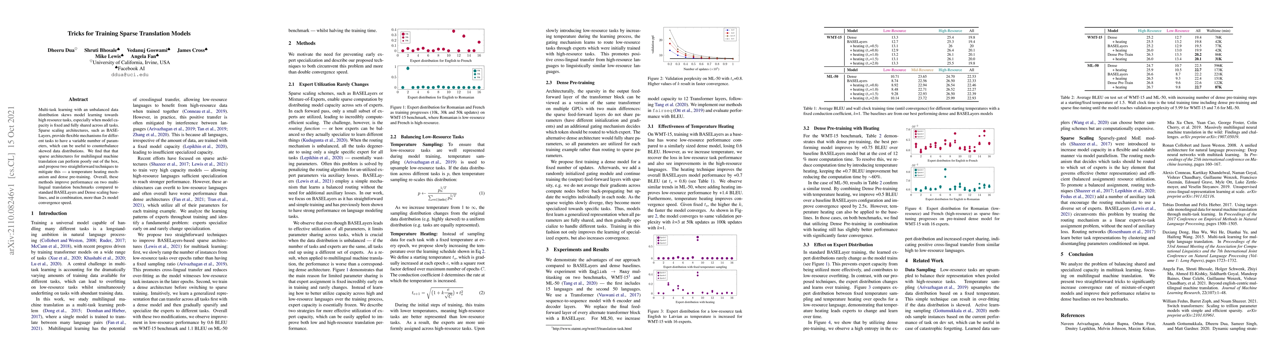 Multi-task learning with an unbalanced data distribution skews model learning towards high resource tasks, especially when model capacity is fixed and fully shared across all tasks. Sparse scaling architectures, such as BASELayers, provide flexible mechanisms for different tasks to have a variable number of parameters, which can be useful to counterbalance skewed data distributions. We find that that sparse architectures for multilingual machine translation can perform poorly out of the box, and propose two straightforward techniques to mitigate this - a temperature heating mechanism and dense pre-training. Overall, these methods improve performance on two multilingual translation benchmarks compared to standard BASELayers and Dense scaling baselines, and in combination, more than 2x model convergence speed.