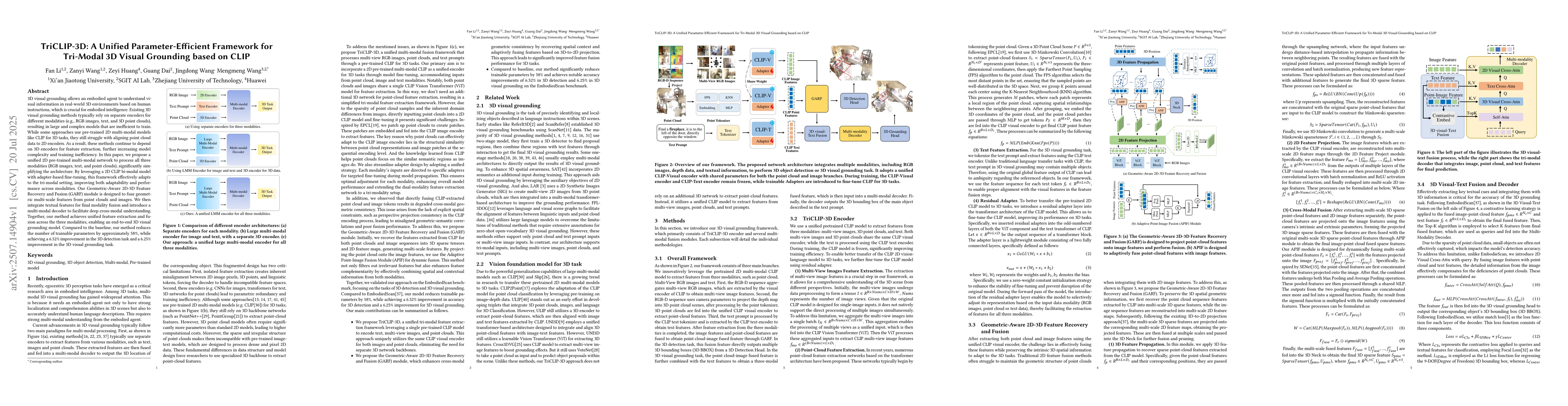 3D visual grounding allows an embodied agent to understand visual information in real-world 3D environments based on human instructions, which is crucial for embodied intelligence. Existing 3D visual grounding methods typically rely on separate encoders for different modalities (e.g., RGB images, text, and 3D point clouds), resulting in large and complex models that are inefficient to train. While some approaches use pre-trained 2D multi-modal models like CLIP for 3D tasks, they still struggle with aligning point cloud data to 2D encoders. As a result, these methods continue to depend on 3D encoders for feature extraction, further increasing model complexity and training inefficiency. In this paper, we propose a unified 2D pre-trained multi-modal network to process all three modalities (RGB images, text, and point clouds), significantly simplifying the architecture. By leveraging a 2D CLIP bi-modal model with adapter-based fine-tuning, this framework effectively adapts to the tri-modal setting, improving both adaptability and performance across modalities. Our Geometric-Aware 2D-3D Feature Recovery and Fusion (GARF) module is designed to fuse geometric multi-scale features from point clouds and images. We then integrate textual features for final modality fusion and introduce a multi-modal decoder to facilitate deep cross-modal understanding. Together, our method achieves unified feature extraction and fusion across the three modalities, enabling an end-to-end 3D visual grounding model. Compared to the baseline, our method reduces the number of trainable parameters by approximately 58\%, while achieving a 6.52\% improvement in the 3D detection task and a 6.25\% improvement in the 3D visual grounding task.