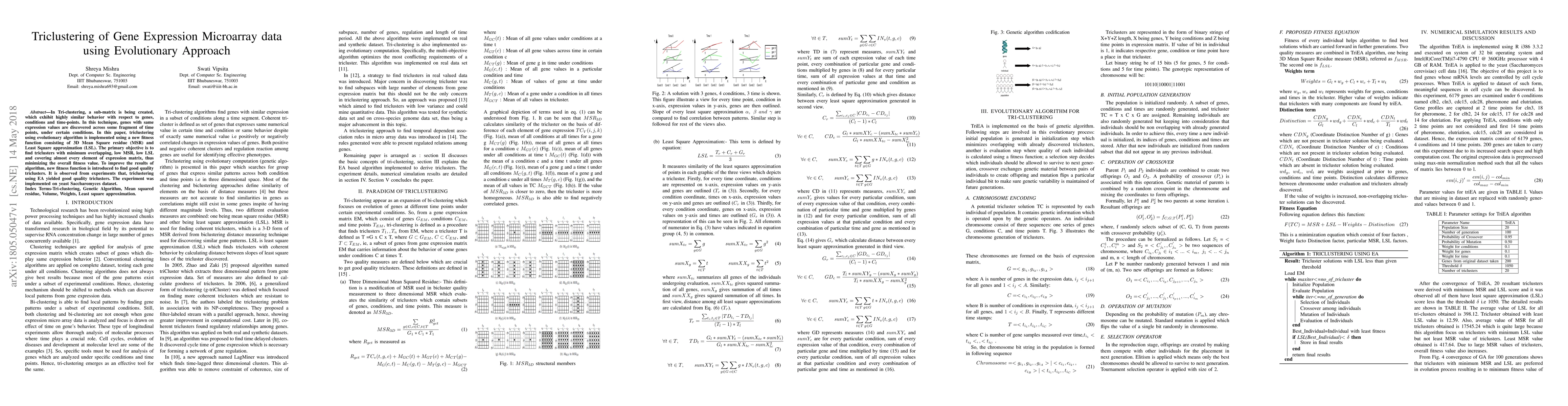 This paper proposes an evolutionary algorithm for triclustering gene expression microarray data, utilizing a novel fitness function combining 3D Mean Square Residue and Least Square Approximation. The goal is to identify triclusters with minimal overlap and low error measures, achieving high coverage of the expression matrix. Experiments on yeast datasets demonstrate the effectiveness of the proposed approach.