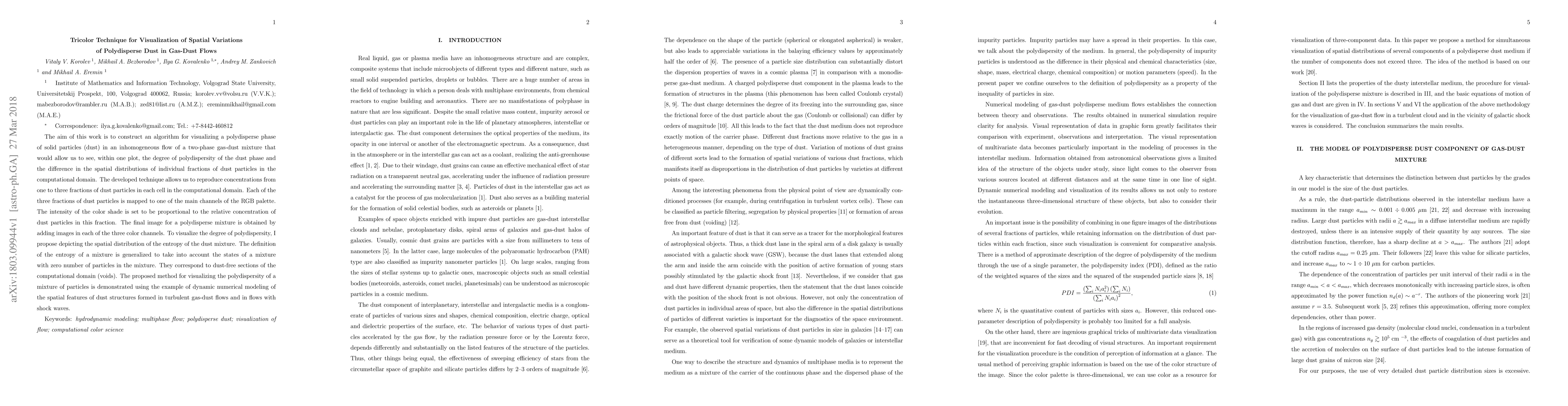 The aim of this work is to construct an algorithm for visualizing a polydisperse phase of solid particles (dust) in an inhomogeneous flow of a two-phase gas-dust mixture that would allow us to see, within one plot, the degree of polydispersity of the dust phase and the difference in the spatial distributions of individual fractions of dust particles in the computational domain. The developed technique allows us to reproduce concentrations from one to three fractions of dust particles in each cell in the computational domain. Each of the three fractions of dust particles is mapped to one of the main channels of the RGB palette. The intensity of the color shade is set to be proportional to the relative concentration of dust particles in this fraction. The final image for a polydisperse mixture is obtained by adding images in each of the three color channels. To visualize the degree of polydispersity, I propose depicting the spatial distribution of the entropy of the dust mixture. The definition of the entropy of a mixture is generalized to take into account the states of a mixture with zero number of particles in the mixture. They correspond to dust-free sections of the computational domain (voids). The proposed method for visualizing the polydispersity of a mixture of particles is demonstrated using the example of dynamic numerical modeling of the spatial features of dust structures formed in turbulent gas-dust flows and in flows with shock waves.
