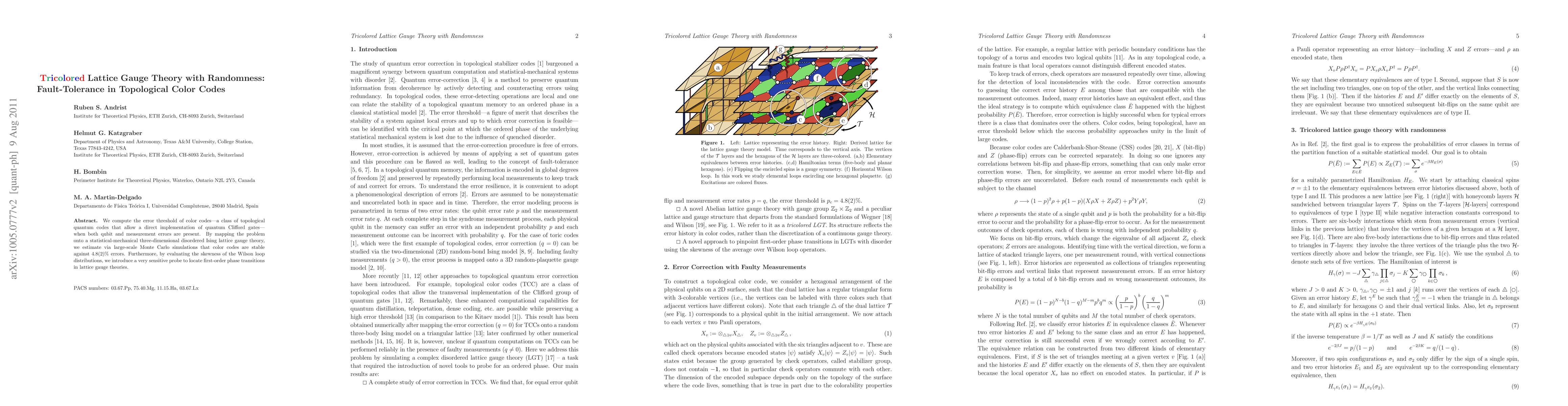 Summary: This study computes the error threshold of topological color codes in the presence of qubit and measurement errors, revealing stability against up to 4.5(2)% errors. Using Monte Carlo simulations, it also introduces a sensitive probe based on Wilson loop distributions to detect phase transitions in lattice gauge theories.