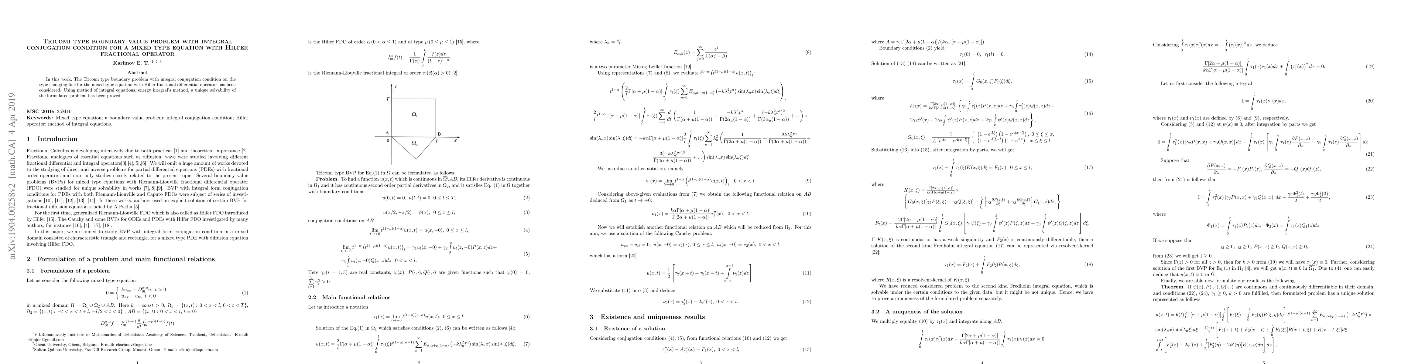 This paper investigates a Tricomi type boundary value problem for a mixed type equation with a Hilfer fractional differential operator, proving its unique solvability via integral equations and energy integral methods, particularly focusing on the integral conjugation condition on the type-changing line.