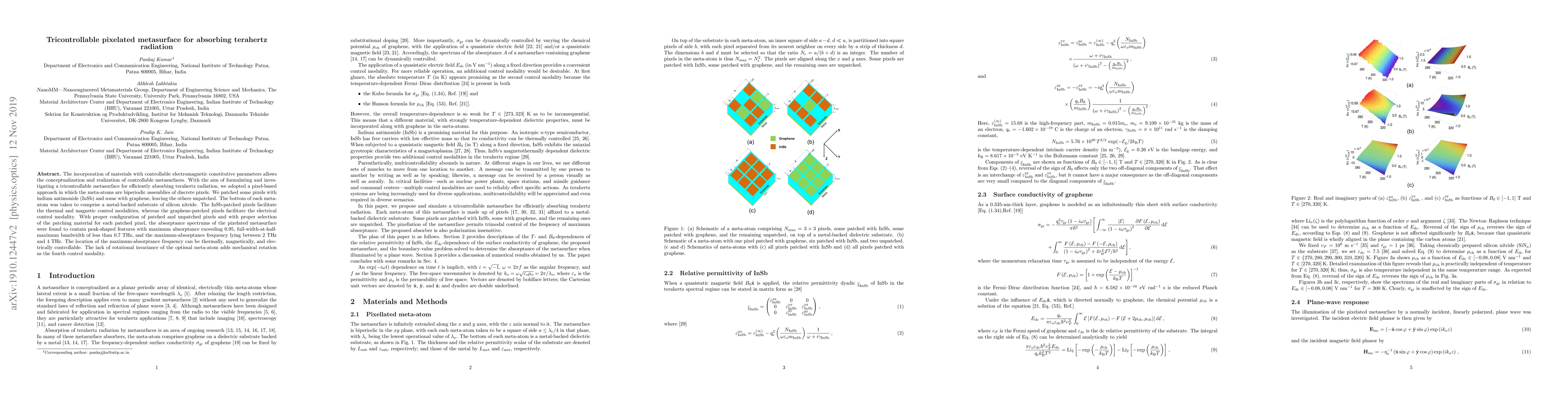 The incorporation of materials with controllable electromagnetic constitutive parameters allows the conceptualization and realization of controllable metasurfaces. With the aim of formulating and investigating a tricontrollable metasurface for efficiently absorbing terahertz radiation, we adopted a pixel-based approach in which the meta-atoms are biperiodic assemblies of discrete pixels. We patched some pixels with indium antimonide (InSb) and some with graphene, leaving the others unpatched. The bottom of each meta-atom was taken to comprise a metal-backed substrate of silicon nitride. The InSb-patched pixels facilitate the thermal and magnetic control modalities, whereas the graphene-patched pixels facilitate the electrical control modality. With proper configuration of patched and unpatched pixels and with proper selection of the patching material for each patched pixel, the absorptance spectrums of the pixelated metasurface were found to contain peak-shaped features with maximum absorptance exceeding 0.95, full-width-at-half-maximum bandwidth of less than 0.7~THz, and the maximum-absorptance frequency lying between 2~THz and 4~THz. The location of the maximum-absorptance frequency can be thermally, magnetically, and electrically controllable. The lack of rotational invariance of the optimal meta-atom adds mechanical rotation as the fourth control modality.