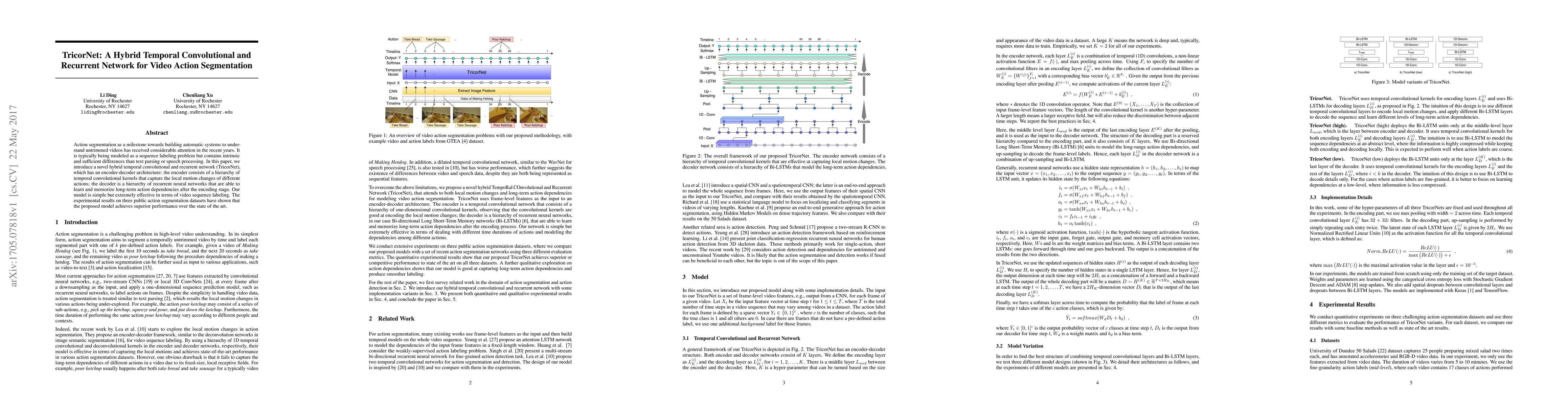 TricorNet is a hybrid network combining temporal convolutional and recurrent layers for video action segmentation, achieving superior performance over existing models on public datasets. The encoder captures local motion changes, while the decoder learns long-term action dependencies.