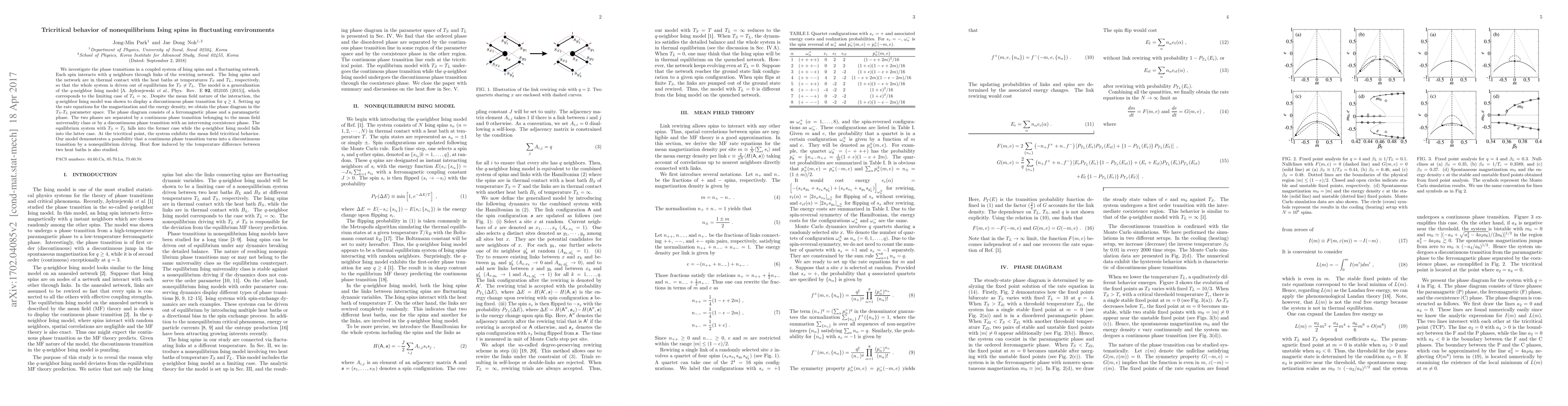 We investigate the phase transitions in a coupled system of Ising spins and a fluctuating network. Each spin interacts with $q$ neighbors through links of the rewiring network. The Ising spins and the network are in thermal contact with the heat baths at temperatures $T_S$ and $T_L$, respectively, so that the whole system is driven out of equilibrium for $T_S \neq T_L$. The model is a generalization of the $q$-neighbor Ising model, which corresponds to the limiting case of $T_L=\infty$. Despite the mean field nature of the interaction, the $q$-neighbor Ising model was shown to display a discontinuous phase transition for $q\geq 4$. Setting up the rate equations for the magnetization and the energy density, we obtain the phase diagram in the $T_S$-$T_L$ parameter space. The phase diagram consists of a ferromagnetic phase and a paramagnetic phase. The two phases are separated by a continuous phase transition belonging to the mean field universality class or by a discontinuous phase transition with an intervening coexistence phase. The equilibrium system with $T_S=T_L$ falls into the former case while the $q$-neighbor Ising model falls into the latter case. At the tricritical point, the system exhibits the mean field tricritical behavior. Our model demonstrates a possibility that a continuous phase transition turns into a discontinuous transition by a nonequilibrium driving. Heat flow induced by the temperature difference between two heat baths is also studied.