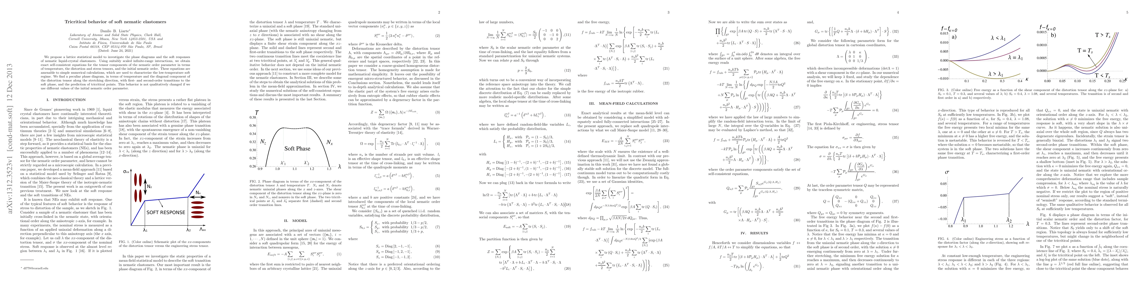The paper proposes a lattice statistical model to study the phase diagrams and soft responses of nematic liquid-crystal elastomers, revealing a unique phase diagram with first- and second-order transitions to a soft phase and tricritical points, characterized through exact self-consistent equations. Numerical calculations confirm the model's predictions, unaffected by variations in initial nematic order.