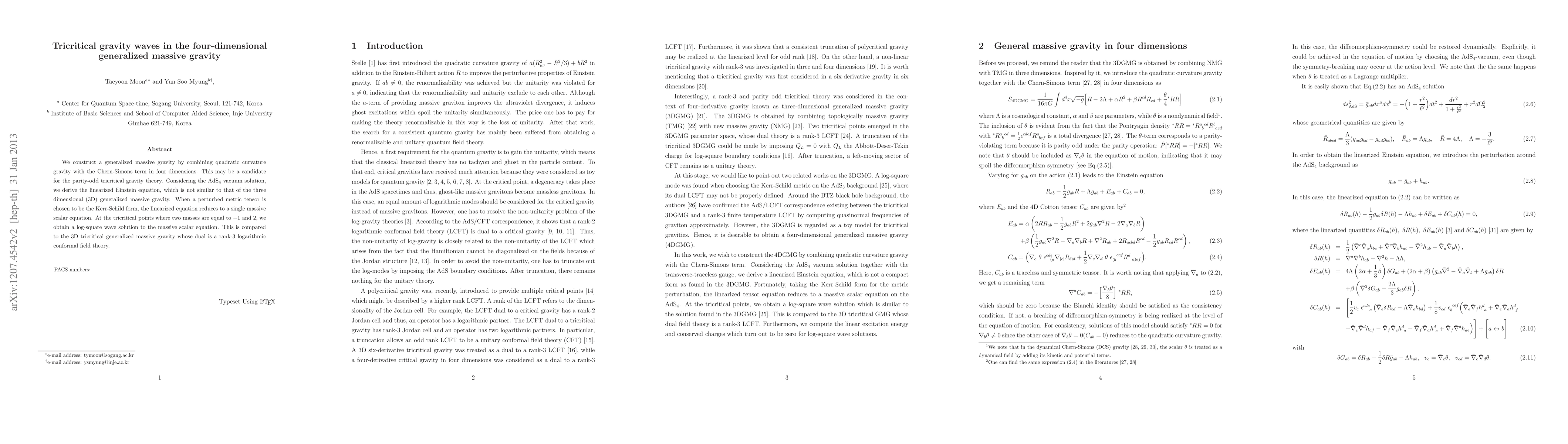 This paper constructs a four-dimensional generalized massive gravity combining quadratic curvature gravity with a Chern-Simons term, identifying it as a candidate for tricritical gravity. The study reveals a unique linearized Einstein equation distinct from its three-dimensional counterpart, leading to a log-square wave solution at tricritical points.