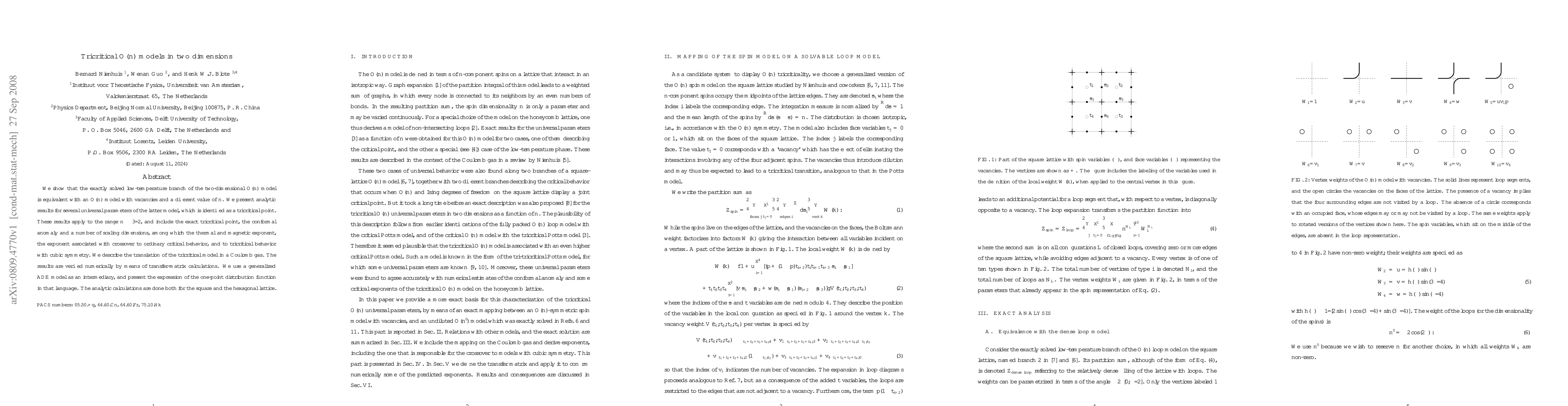 The paper establishes an equivalence between the low-temperature branch of the two-dimensional O(n) model and an O(n) model with vacancies, providing analytic and numerical results for universal parameters at a tricritical point.