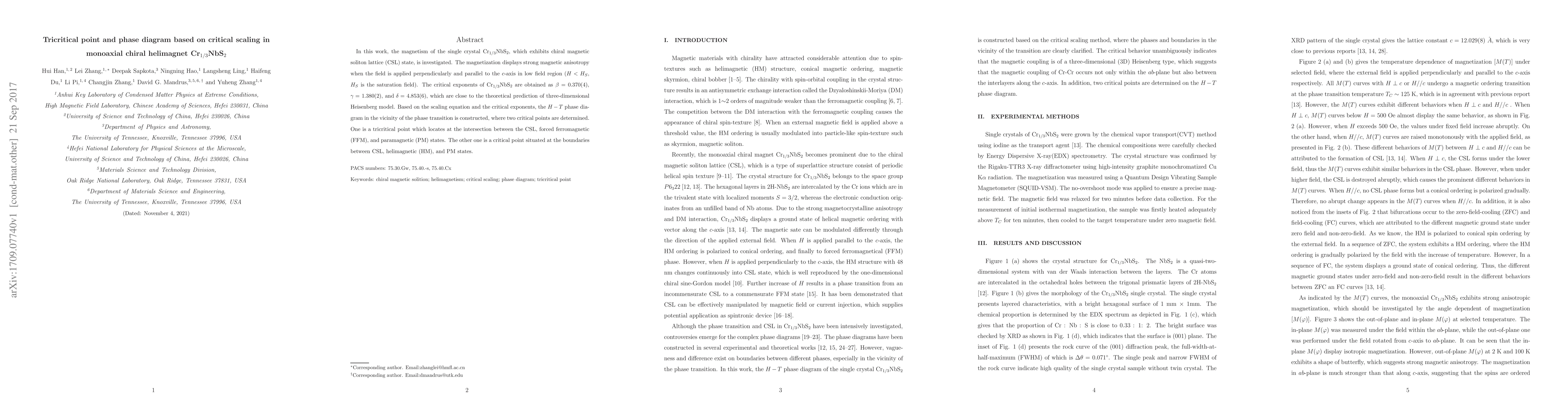 Researchers studied Cr1/3NbS2, a material with chiral magnetic soliton lattice, and found two critical points in its phase diagram, including a tricritical point near the intersection of three states.