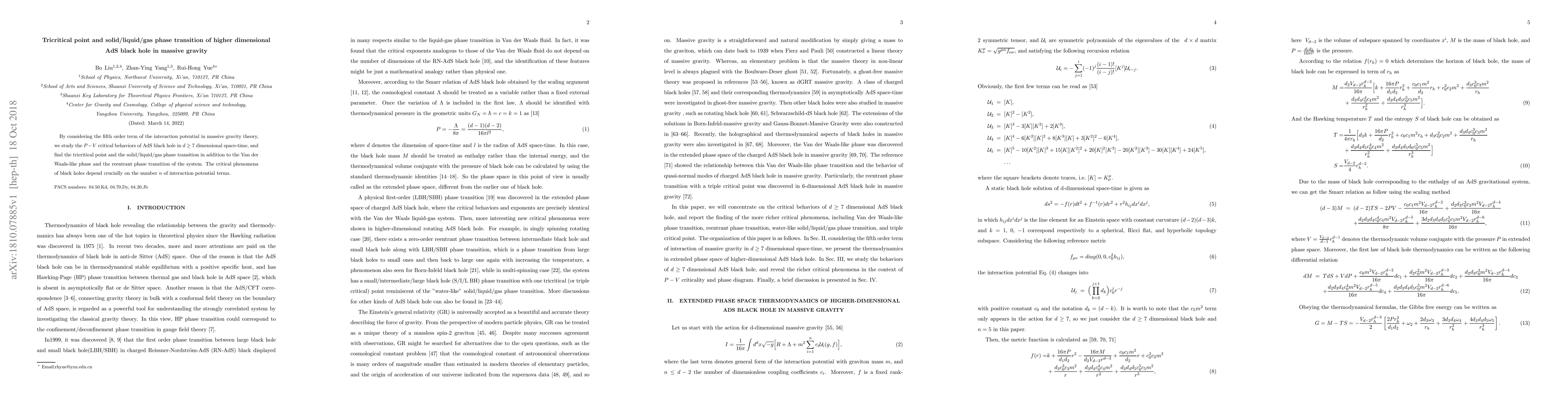 By considering the fifth order term of the interaction potential in massive gravity theory, we study the $P-V$ critical behaviors of AdS black hole in $d \geq 7$ dimensional space-time, and find the tricritical point and the solid/liquid/gas phase transition in addition to the Van der Waals-like phase and the reentrant phase transition of the system. The critical phenomena of black holes depend crucially on the number $n$ of interaction potential terms.