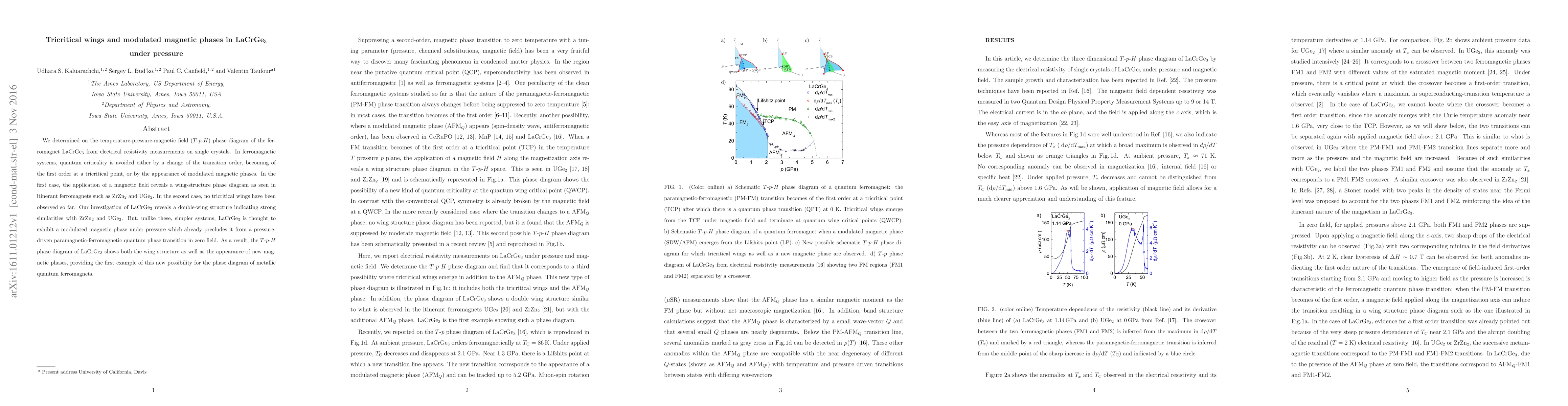 This study reveals a double-wing structure in LaCrGe$_3$'s $T$-$p$-$H$ phase diagram, akin to ZrZn$_2$ and UGe$_2$, while also identifying a modulated magnetic phase under pressure, a first for metallic quantum ferromagnets. This dual feature precludes a quantum phase transition in zero field.