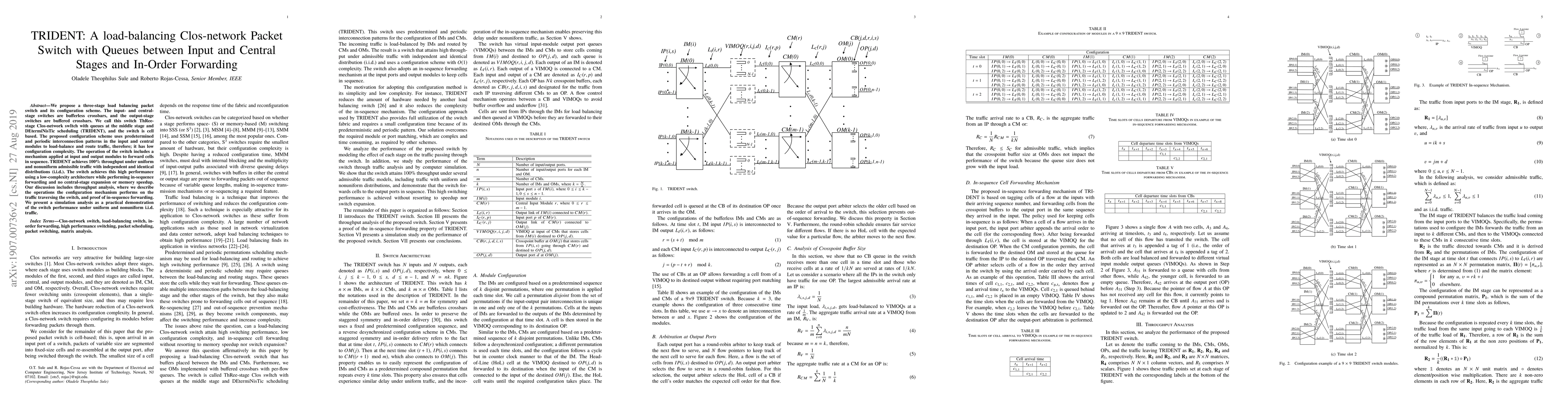 TRIDENT is a three-stage load-balancing packet switch with queues between the input and central stages, utilizing a low-complexity architecture to achieve 100% throughput under various traffic conditions while maintaining in-sequence forwarding. The proposed configuration scheme simplifies load balancing and routing with predetermined interconnection patterns.