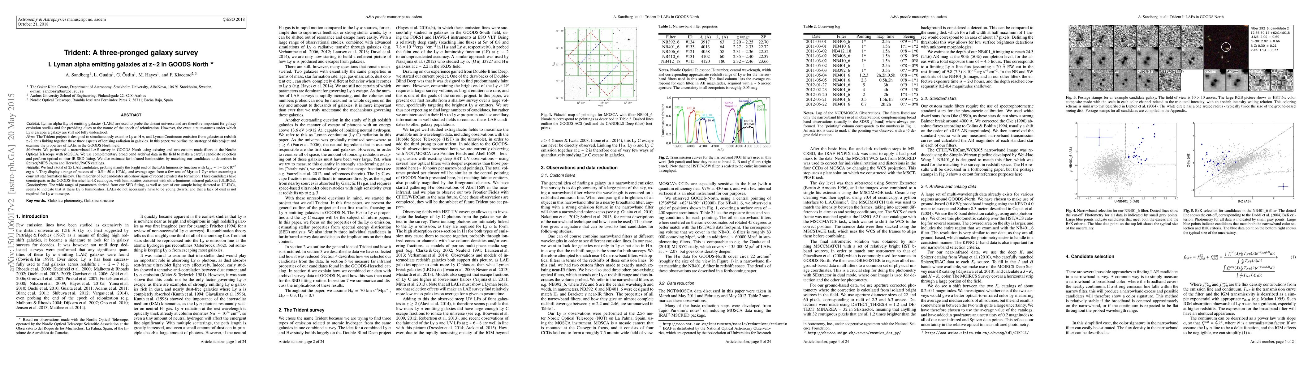 Context. Lyman alpha emitting galaxies (LAEs) are used to probe the distant universe and are therefore important for galaxy evolution studies and for providing clues to the nature of the epoch of reionization, but the exact circumstances under which Lyman alpha escapes a galaxy are still not fully understood. Aims. The Trident project is designed to simultaneously examine Lyman alpha, H-alpha and Lyman Continuum emission from galaxies at redshift z~2, thus linking together these three aspects of ionising radiation in galaxies. In this paper, we outline the strategy of this project and examine the properties of LAEs in the GOODS North field. Methods. We performed a narrowband LAE survey in GOODS North using existing and two custom made filters at the Nordic Optical Telescope with MOSCA. We use complementary broad band archival data in the field to make a careful candidate selection and perform optical to near-IR SED fitting. We also estimate far-infrared luminosities by matching our candidates to detections in Spitzer/MIPS 24{\mu}m and Herschel/PACS catalogs. Results. We find a total of 25 LAE candidates, probing mainly the bright end of the LAE luminosity function with L_Ly {\alpha} ~ 1-15e42 erg/s. They display a range of masses of ~0.5-50e9 M_solar, and average ages from a few tens of Myr to 1 Gyr when assuming a constant star formation history. The majority of our candidates also show signs of recent elevated star formation. Three candidates have counterparts in the GOODS-Herschel far-IR catalogue, with luminosities consistent with ultra-luminous infrared galaxies (ULIRGs). Conclusions. The wide range of parameters derived from our SED fitting, as well as part of our sample being detected as ULIRGs, seems to indicate that at these Lyman alpha luminosities, LAEs do not necessarily have to be young dwarfs, and that a lack of dust is not required for Lyman alpha to escape.