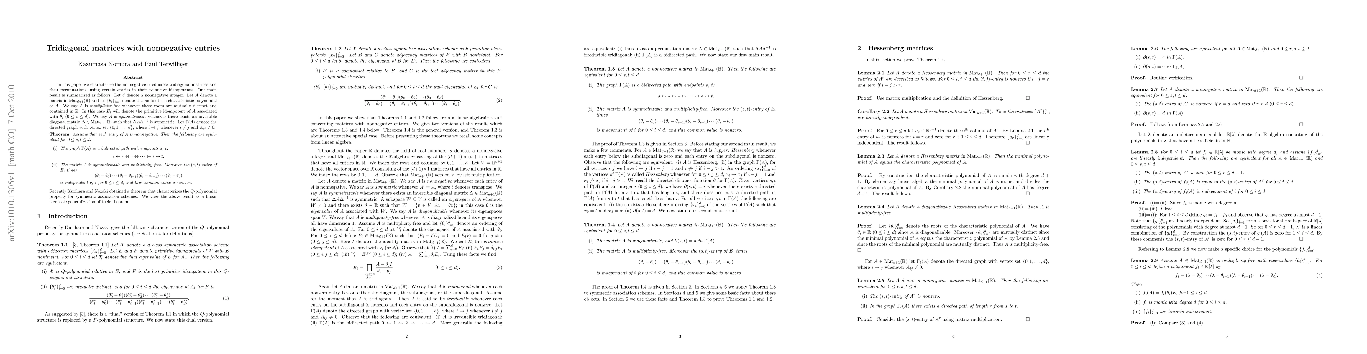 In this paper we characterize the nonnegative irreducible tridiagonal matrices and their permutations, using certain entries in their primitive idempotents. Our main result is summarized as follows. Let $d$ denote a nonnegative integer. Let $A$ denote a matrix in $\matR$ and let $\{\th_i\}_{i=0}^d$ denote the roots of the characteristic polynomial of $A$. We say $A$ is multiplicity-free whenever these roots are mutually distinct and contained in $\R$. In this case $E_i$ will denote the primitive idempotent of $A$ associated with $\th_i$ $(0 \leq i \leq d)$. We say $A$ is symmetrizable whenever there exists an invertible diagonal matrix $\Delta \in \matR$ such that $\Delta A \Delta^{-1}$ is symmetric. Let $\Gamma(A)$ denote the directed graph with vertex set $\{0,1,...,d\}$, where $i \rightarrow j$ whenever $i \neq j$ and $A_{ij} \neq 0$. Theorem: Assume that each entry of $A$ is nonnegative. Then the following are equivalent for $0 \leq s,t \leq d$: (i) The graph $\Gamma(A)$ is a bidirected path with endpoints $s$, $t$: (ii) The matrix $A$ is symmetrizable and multiplicity-free. Moreover the $(s,t)$-entry of $E_i$ times $(\th_i-\th_0)...(\th_i-\th_{i-1})(\th_i-\th_{i+1})...(\th_i-\th_d)$ is independent of $i$ for $0 \leq i \leq d$, and this common value is nonzero. Recently Kurihara and Nozaki obtained a theorem that characterizes the $Q$-polynomial property for symmetric association schemes. We view the above result as a linear algebraic generalization of their theorem.