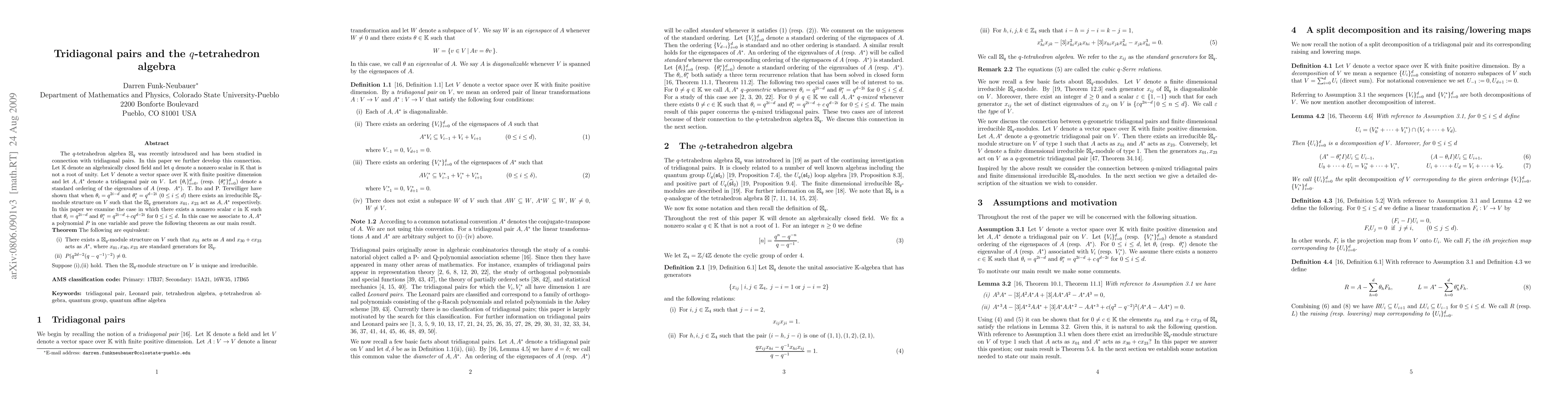 This paper explores the relationship between tridiagonal pairs and the q-tetrahedron algebra $\boxtimes_q$, proving that under specific eigenvalue conditions, there exists a unique irreducible $\boxtimes_q$-module structure on a vector space V, with the generators acting as the tridiagonal pair elements.