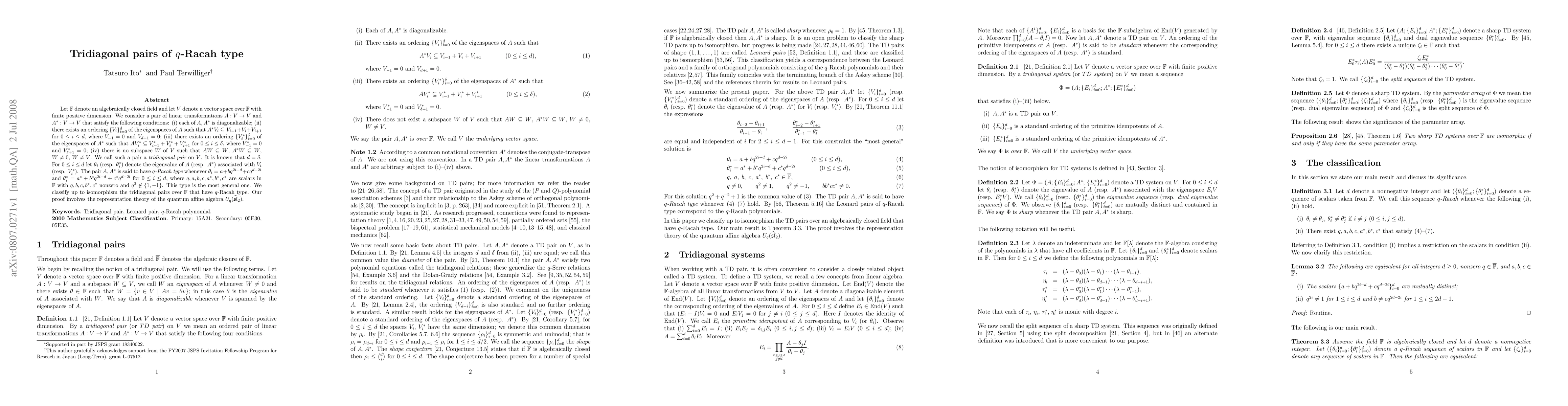 Let $K$ denote an algebraically closed field and let $V$ denote a vector space over $K$ with finite positive dimension. We consider a pair of linear transformations $A:V \to V$ and $A^*:V \to V$ that satisfy the following conditions: (i) each of $A,A^*$ is diagonalizable; (ii) there exists an ordering $\lbrace V_i\rbrace_{i=0}^d$ of the eigenspaces of $A$ such that $A^* V_i \subseteq V_{i-1} + V_{i} + V_{i+1}$ for $0 \leq i \leq d$, where $V_{-1}=0$ and $V_{d+1}=0$; (iii) there exists an ordering $\lbrace V^*_i\rbrace_{i=0}^\delta$ of the eigenspaces of $A^*$ such that $A V^*_i \subseteq V^*_{i-1} + V^*_{i} + V^*_{i+1}$ for $0 \leq i \leq \delta$, where $V^*_{-1}=0$ and $V^*_{\delta+1}=0$; (iv) there is no subspace $W$ of $V$ such that $AW \subseteq W$, $A^* W \subseteq W$, $W \neq 0$, $W \neq V$. We call such a pair a {\it tridiagonal pair} on $V$. It is known that $d=\delta$. For $0 \leq i \leq d$ let $\theta_i$ (resp. $\theta^*_i$) denote the eigenvalue of $A$ (resp. $A^*$) associated with $V_i$ (resp. $V^*_i$). The pair $A,A^*$ is said to have {\it $q$-Racah type} whenever $\theta_i = a + b q^{2i-d}+ c q^{d-2i}$ and $\theta^*_i = a^* + b^*q^{2i-d}+c^*q^{d-2i}$ for $0 \leq i \leq d$, where $q, a,b,c,a^*,b^*,c^*$ are scalars in $K$ with $q,b,c,b^*,c^*$ nonzero and $q^2 \not\in \lbrace 1,-1\rbrace$. This type is the most general one. We classify up to isomorphism the tridiagonal pairs over $K$ that have $q$-Racah type. Our proof involves the representation theory of the quantum affine algebra $U_q(\widehat{\mathfrak{sl}}_2)$.