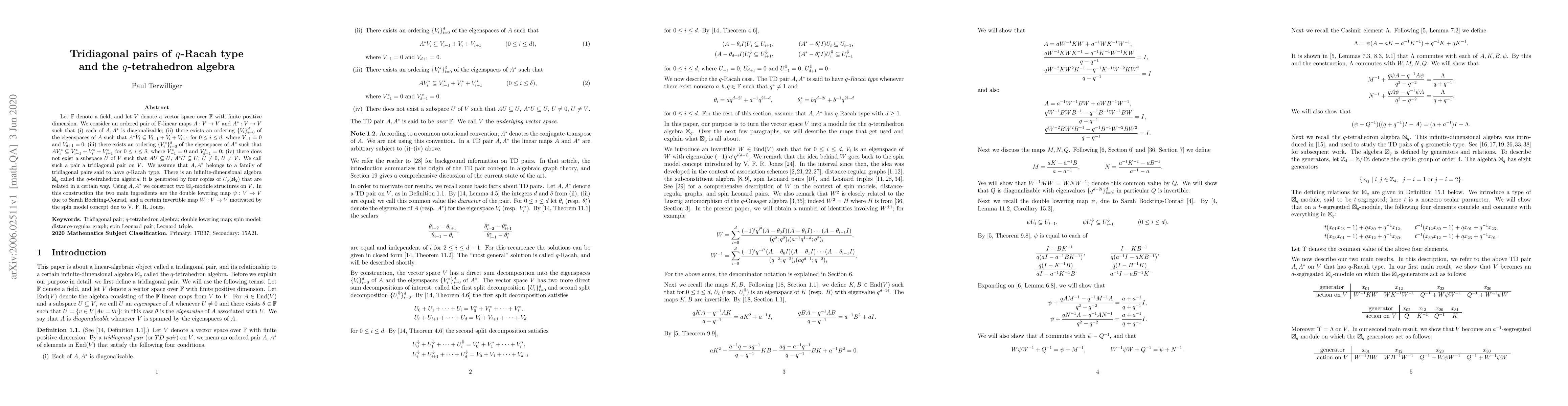 Let $\mathbb F$ denote a field, and let $V$ denote a vector space over $\mathbb F$ with finite positive dimension. We consider an ordered pair of $\mathbb F$-linear maps $A: V \to V$ and $A^*:V\to V$ such that (i) each of $A,A^*$ is diagonalizable; (ii) there exists an ordering $\lbrace V_i\rbrace_{i=0}^d$ of the eigenspaces of $A$ such that $A^* V_i \subseteq V_{i-1} + V_i+ V_{i+1}$ for $0 \leq i \leq d$, where $V_{-1} = 0$ and $V_{d+1}= 0$; (iii) there exists an ordering $\lbrace V^*_i\rbrace_{i=0}^{\delta}$ of the eigenspaces of $A^*$ such that $A V^*_i \subseteq V^*_{i-1} + V^*_i+ V^*_{i+1} $ for $0 \leq i \leq \delta $, where $V^*_{-1} = 0$ and $V^*_{\delta+1}= 0$; (iv) there does not exist a subspace $U$ of $V$ such that $AU\subseteq U$, $A^*U \subseteq U$, $U\not=0$, $U\not=V$. We call such a pair a tridiagonal pair on $V$. We assume that $A, A^*$ belongs to a family of tridiagonal pairs said to have $q$-Racah type. There is an infinite-dimensional algebra $\boxtimes_q$ called the $q$-tetrahedron algebra; it is generated by four copies of $U_q(\mathfrak{sl}_2)$ that are related in a certain way. Using $A, A^*$ we construct two $\boxtimes_q$-module structures on $V$. In this construction the two main ingredients are the double lowering map $\psi:V\to V$ due to Sarah Bockting-Conrad, and a certain invertible map $W:V\to V$ motivated by the spin model concept due to V. F. R. Jones.