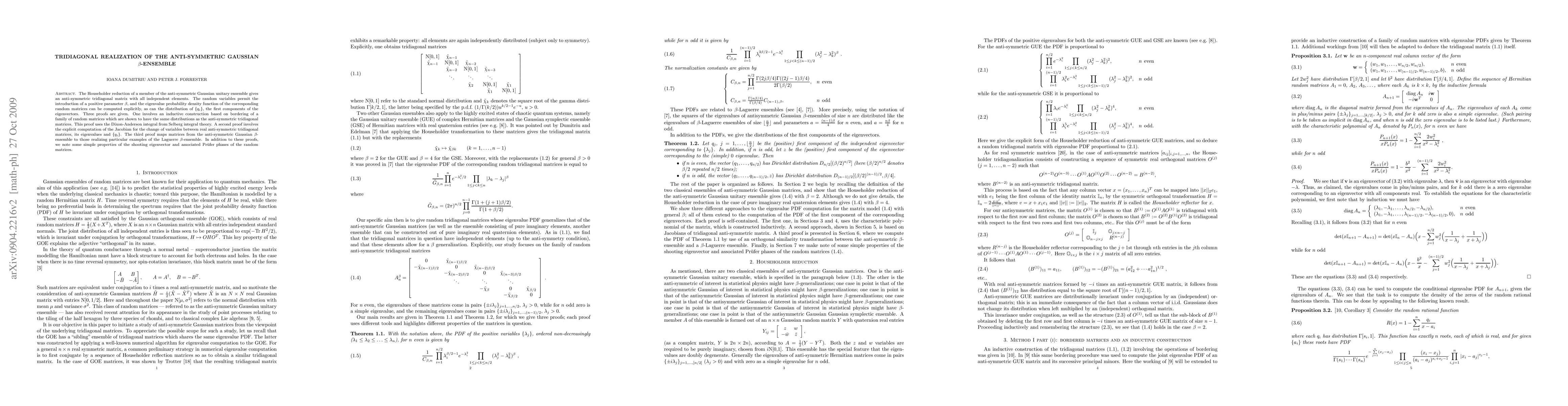 The Householder reduction of a member of the anti-symmetric Gaussian unitary ensemble gives an anti-symmetric tridiagonal matrix with all independent elements. The random variables permit the introduction of a positive parameter $\beta$, and the eigenvalue probability density function of the corresponding random matrices can be computed explicitly, as can the distribution of $\{q_i\}$, the first components of the eigenvectors. Three proofs are given. One involves an inductive construction based on bordering of a family of random matrices which are shown to have the same distributions as the anti-symmetric tridiagonal matrices. This proof uses the Dixon-Anderson integral from Selberg integral theory. A second proof involves the explicit computation of the Jacobian for the change of variables between real anti-symmetric tridiagonal matrices, its eigenvalues and $\{q_i\}$. The third proof maps matrices from the anti-symmetric Gaussian $\beta$-ensemble to those realizing particular examples of the Laguerre $\beta$-ensemble. In addition to these proofs, we note some simple properties of the shooting eigenvector and associated Pr\"ufer phases of the random matrices.