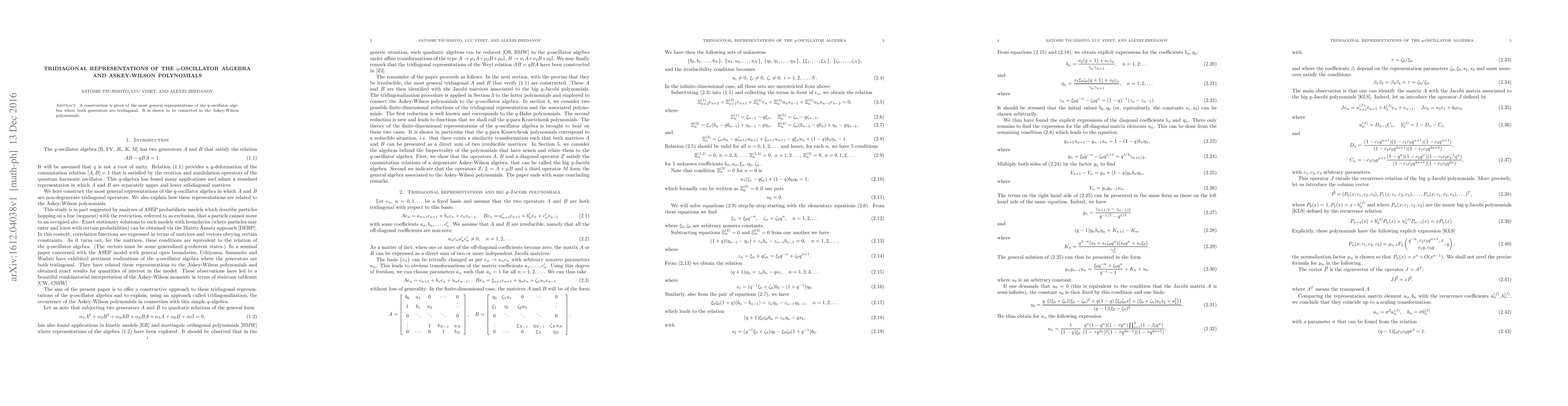 The paper introduces a tridiagonal representation of the q-oscillator algebra and demonstrates its connection to Askey-Wilson polynomials, providing a novel perspective on these polynomials.