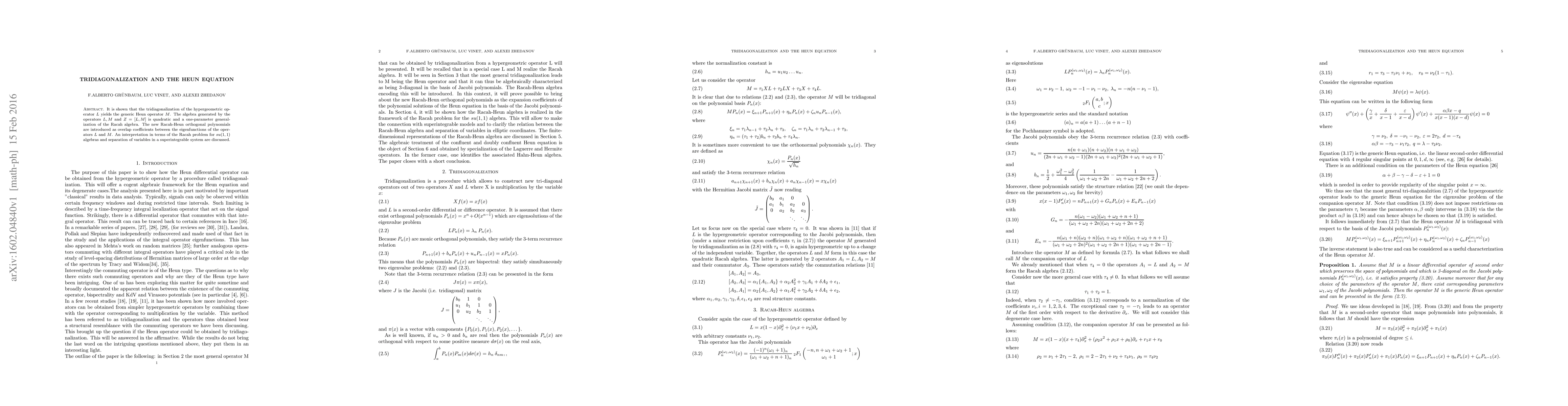 It is shown that the tridiagonalization of the hypergeometric operator $L$ yields the generic Heun operator $M$. The algebra generated by the operators $L,M$ and $Z=[L,M]$ is quadratic and a one-parameter generalization of the Racah algebra. The new Racah-Heun orthogonal polynomials are introduced as overlap coefficients between the eigenfunctions of the operators $L$ and $M$. An interpretation in terms of the Racah problem for $su(1,1)$ algebras and separation of variables in a superintegrable system are discussed.