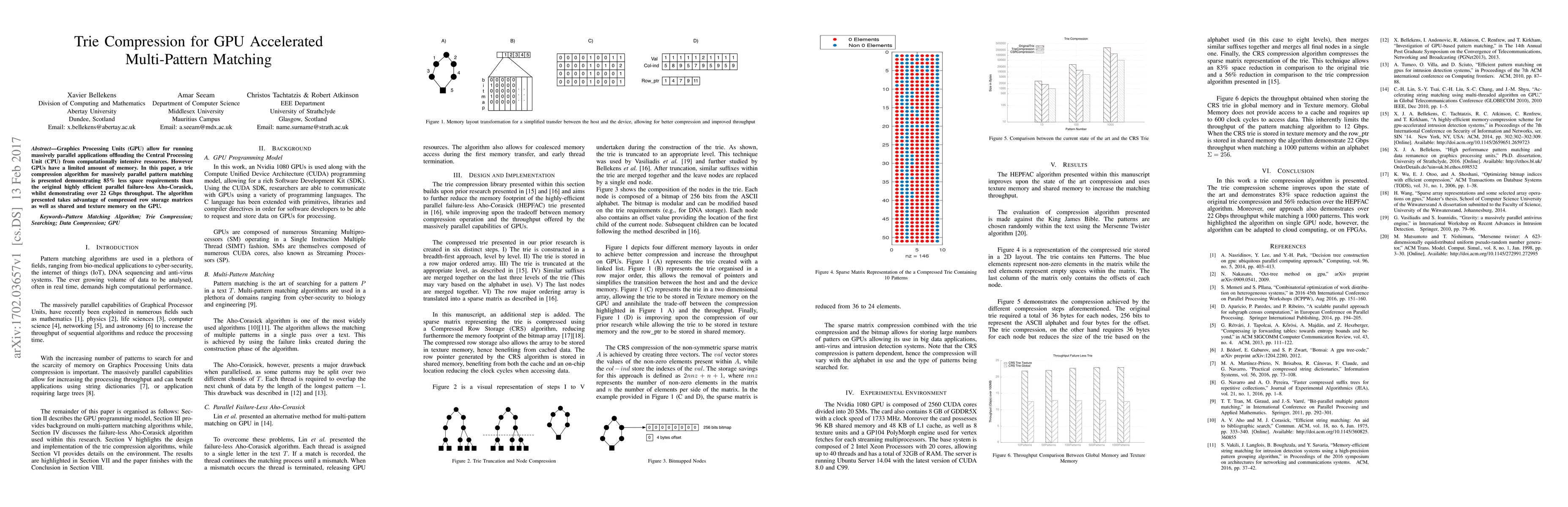 This paper introduces a trie compression algorithm for GPU-accelerated multi-pattern matching, achieving 85% less memory usage compared to the Aho-Corasick algorithm while maintaining over 22 Gbps throughput. The method leverages compressed row storage matrices and GPU memory types for efficiency.
