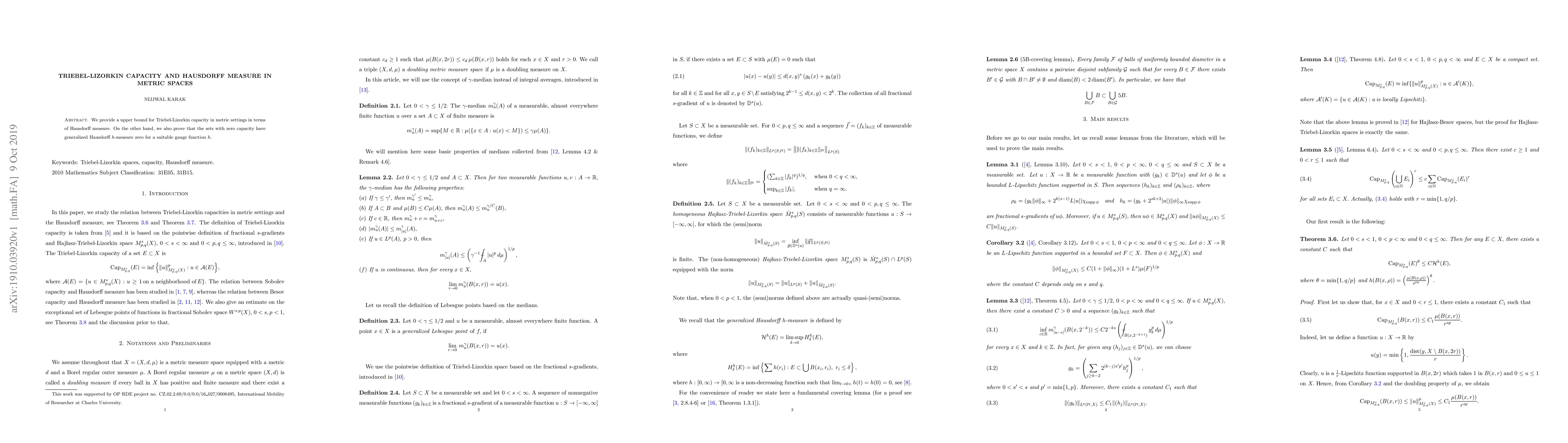 This paper establishes an upper bound for the Triebel-Lizorkin capacity in metric spaces in relation to Hausdorff measure and demonstrates that sets with zero capacity have generalized Hausdorff measure zero for a specific gauge function.