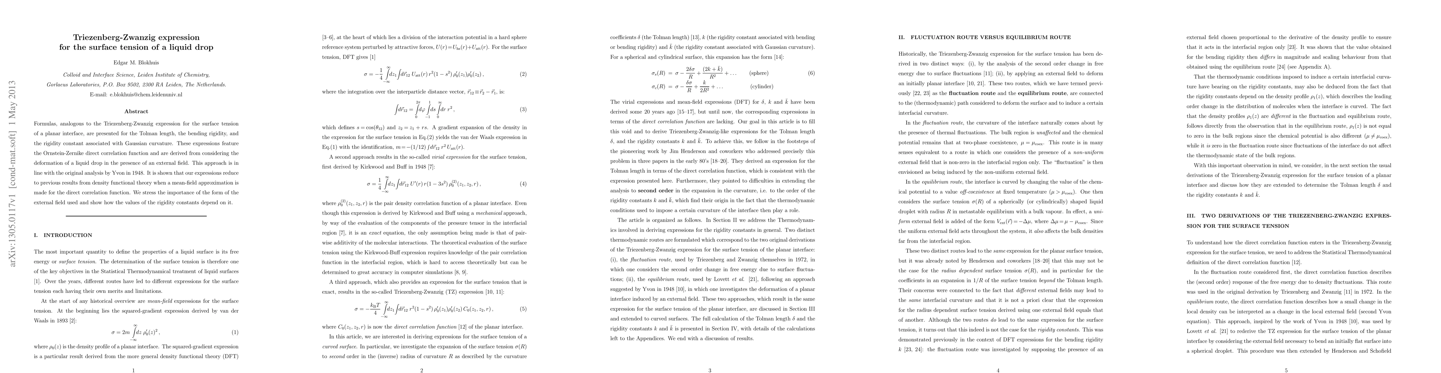 This paper presents formulas for the surface tension of a liquid drop, analogous to the Triezenberg-Zwanzig expression for planar interfaces, and includes the Tolman length, bending rigidity, and Gaussian curvature rigidity constant. The derivations consider the deformation of a liquid drop under an external field, aligning with Yvon's 1948 analysis.