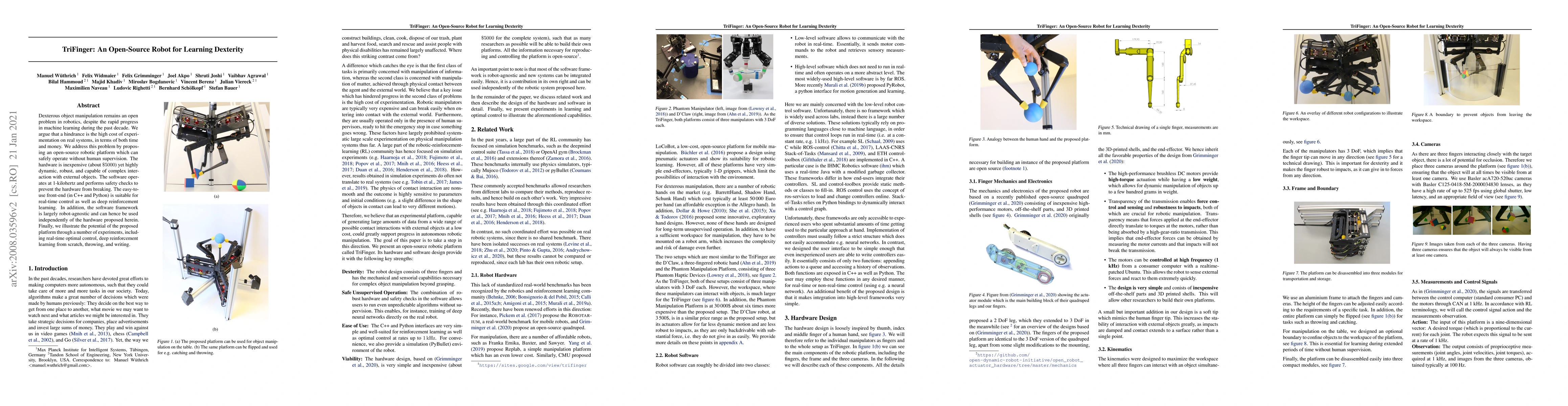 The TriFinger robot is an open-source, low-cost platform designed to facilitate research in dexterous object manipulation, featuring robust hardware and a versatile software framework for real-time control and deep reinforcement learning. Experiments demonstrate its capabilities in tasks like optimal control, deep learning, throwing, and writing.