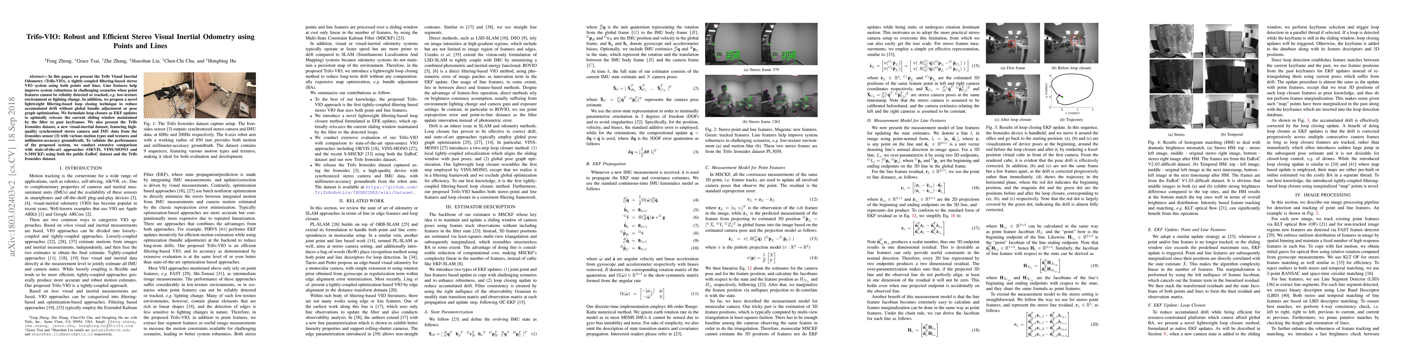 In this paper, we present the Trifo Visual Inertial Odometry (Trifo-VIO), a tightly-coupled filtering-based stereo VIO system using both points and lines. Line features help improve system robustness in challenging scenarios when point features cannot be reliably detected or tracked, e.g. low-texture environment or lighting change. In addition, we propose a novel lightweight filtering-based loop closing technique to reduce accumulated drift without global bundle adjustment or pose graph optimization. We formulate loop closure as EKF updates to optimally relocate the current sliding window maintained by the filter to past keyframes. We also present the Trifo Ironsides dataset, a new visual-inertial dataset, featuring high-quality synchronized stereo camera and IMU data from the Ironsides sensor [3] with various motion types and textures and millimeter-accuracy groundtruth. To validate the performance of the proposed system, we conduct extensive comparison with state-of-the-art approaches (OKVIS, VINS-MONO and S-MSCKF) using both the public EuRoC dataset and the Trifo Ironsides dataset.