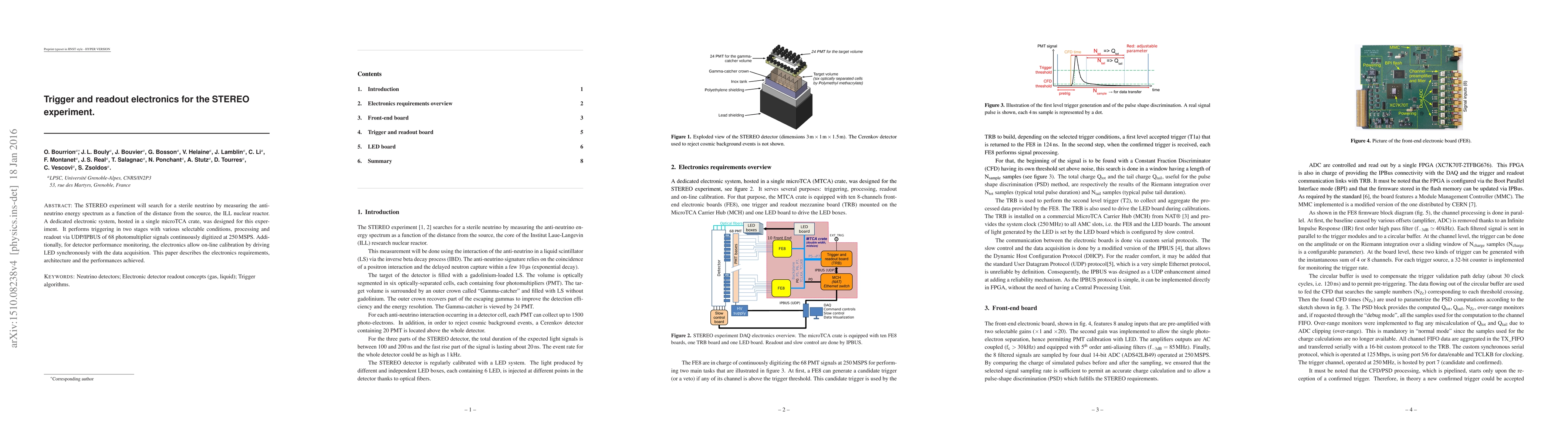 The STEREO experiment employs a microTCA-based electronic system for triggering and readout, designed to detect sterile neutrinos by measuring anti-neutrino energy spectra from the ILL reactor. The system features two-stage triggering, continuous digitization of 68 photomultiplier signals, and on-line calibration for detector performance monitoring.