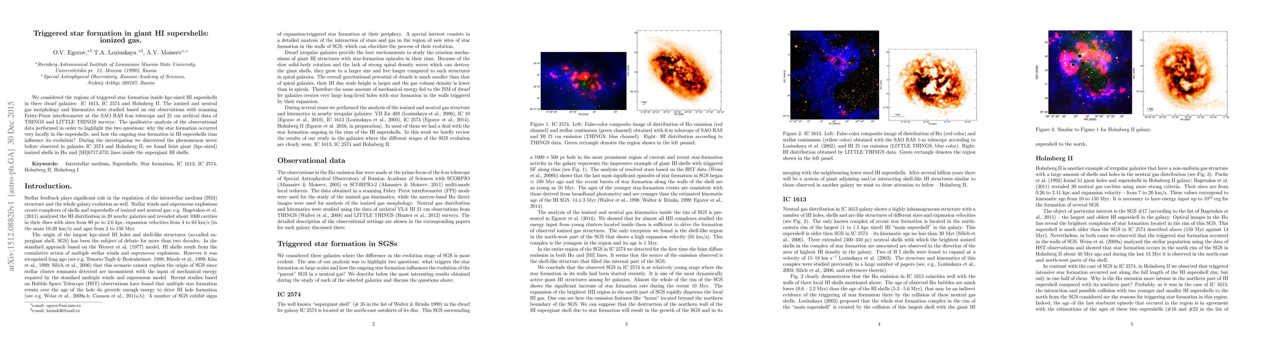 We considered the regions of triggered star formation inside kpc-sized HI supershells in three dwarf galaxies: IC 1613, IC 2574 and Holmberg II. The ionized and neutral gas morphology and kinematics were studied based on our observations with scanning Fabry-Perot interferometer at the SAO RAS 6-m telescope and 21 cm archival data of THINGS and LITTLE THINGS surveys. The qualitative analysis of the observational data performed in order to highlight the two questions: why the star formation occurred very locally in the supershells, and how the ongoing star formation in HI supershells rims influence its evolution? During the investigation we discovered the phenomenon never observed before in galaxies IC 2574 and Holmberg II: we found faint giant (kpc-sized) ionized shells in H-alpha and [SII]6717,6731 lines inside the supergiant HI shells.