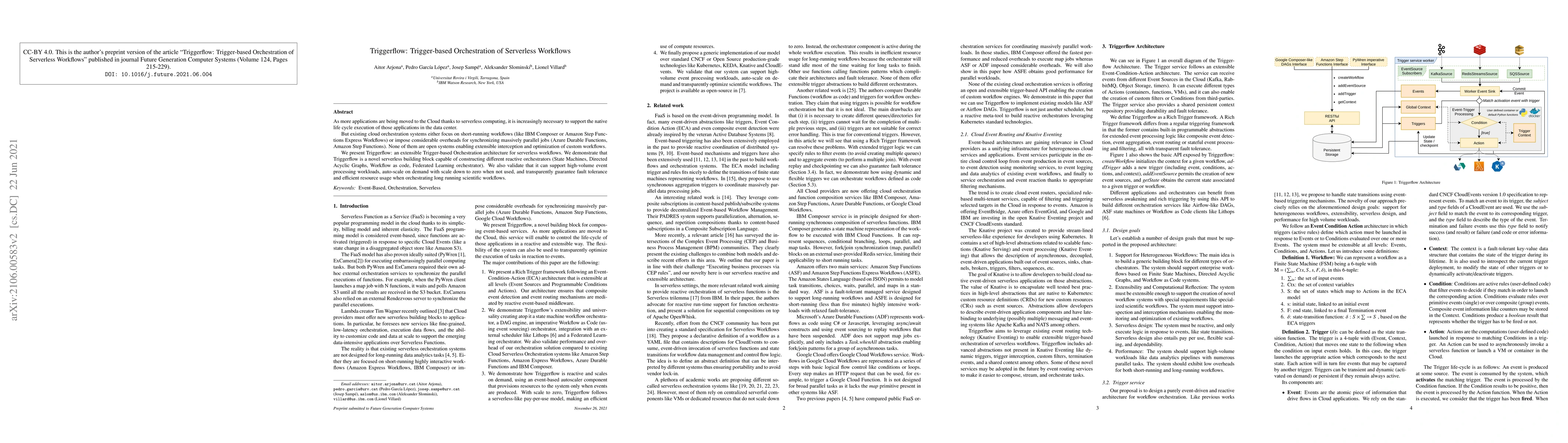 Title: Triggerflow: Trigger-based Orchestration of Serverless Workflows Summary: Triggerflow presents an extensible orchestration architecture for serverless workflows, supporting various reactive orchestrators and enabling high-volume event processing, auto-scaling, and efficient resource management for long-running applications.