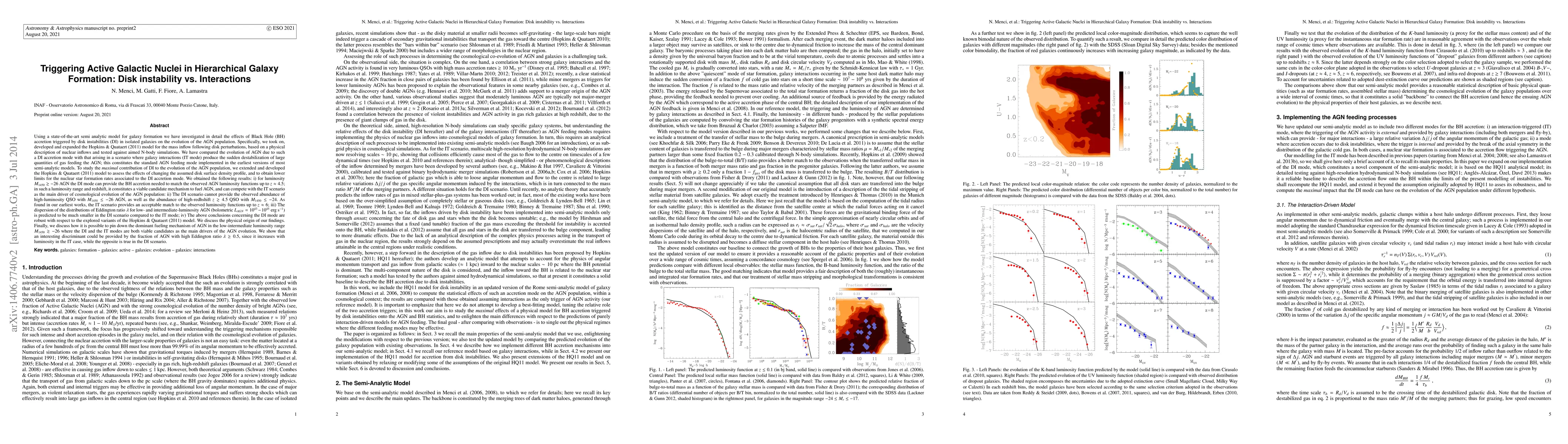 Using a semi analytic model for galaxy formation we investigate the effects of Black Hole accretion triggered by disk instabilities (DI) in isolated galaxies on the evolution of AGN. Specifically, we took on, developed and expanded the Hopkins & Quataert (2011) model for the mass inflow following disk perturbations, and compare the corresponding evolution of the AGN population with that arising in a scenario where galaxy interactions trigger AGN (IT mode). We extended and developed the DI model by including different disk surface density profiles, to study the maximal contribution of DI to the evolution of the AGN population. We obtained the following results: i) for luminosities corresponding to $M_{1450}\gtrsim -26$ the DI mode can provide the BH accretion needed to match the observed AGN luminosity functions up to $z \approx 4.5$; in such a luminosity range and redshift, it can compete with the IT scenario as the main driver of cosmological evolution of AGN; ii) The DI scenario cannot provide the observed abundance of high-luminosity QSO with $M_{1450}\lesssim -26$ AGN, as well as the abundance of high-redhshift $z \approx 4.5$ QSOs with $M_{1450}\lesssim -24$, while the IT scenario provides an acceptable match up to $z \approx 6$, as found in our earliest works; iii) The dispersion of the distributions of Eddington ratio for low- and intermediate-luminosity AGN (bolometric $L_{AGN}$ = $10^{43}$ - $10^{45}$ erg/s) is predicted to be much smaller in the DI scenario compared to the IT mode; iv) The above conclusions are robust with respect to the explored variants of the Hopkins & Quataert (2011) model. We discuss the physical origin of our findings, and how it is possible to pin down the dominant fueling mechanism in the low-intermediate luminosity range $M_{1450}\gtrsim -26$ where both the DI and the IT modes are viable candidates as drivers for the AGN evolution.