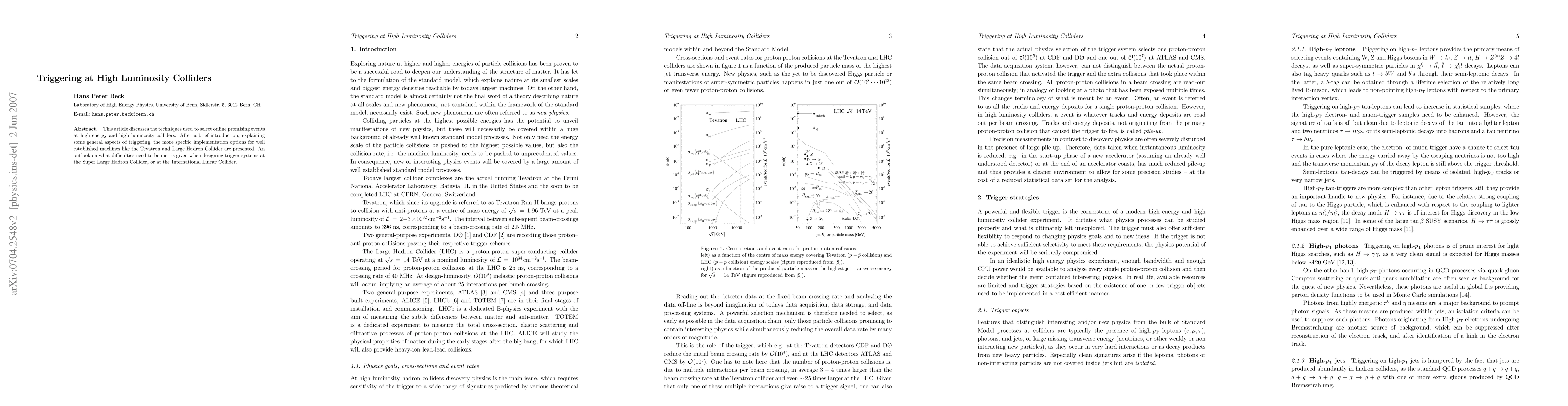 This article discusses the techniques used to select online promising events at high energy and high luminosity colliders. After a brief introduction, explaining some general aspects of triggering, the more specific implementation options for well established machines like the Tevatron and Large Hadron Collider are presented. An outlook on what difficulties need to be met is given when designing trigger systems at the Super Large Hadron Collider, or at the International Linear Collider