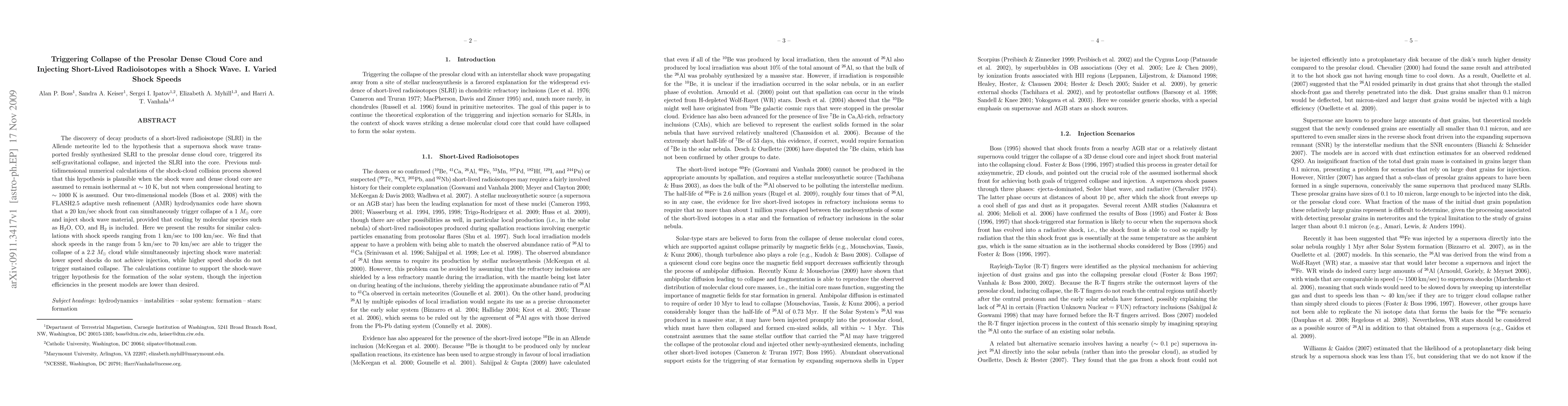 The discovery of decay products of a short-lived radioisotope (SLRI) in the Allende meteorite led to the hypothesis that a supernova shock wave transported freshly synthesized SLRI to the presolar dense cloud core, triggered its self-gravitational collapse, and injected the SLRI into the core. Previous multidimensional numerical calculations of the shock-cloud collision process showed that this hypothesis is plausible when the shock wave and dense cloud core are assumed to remain isothermal at ~10 K, but not when compressional heating to ~1000 K is assumed. Our two-dimensional models (Boss et al. 2008) with the FLASH2.5 adaptive mesh refinement (AMR) hydrodynamics code have shown that a 20 km/sec shock front can simultaneously trigger collapse of a 1 solar mass core and inject shock wave material, provided that cooling by molecular species such as H2O, CO, and H2 is included. Here we present the results for similar calculations with shock speeds ranging from 1 km/sec to 100 km/sec. We find that shock speeds in the range from 5 km/sec to 70 km/sec are able to trigger the collapse of a 2.2 solar mass cloud while simultaneously injecting shock wave material: lower speed shocks do not achieve injection, while higher speed shocks do not trigger sustained collapse. The calculations continue to support the shock-wave trigger hypothesis for the formation of the solar system, though the injection efficiencies in the present models are lower than desired.