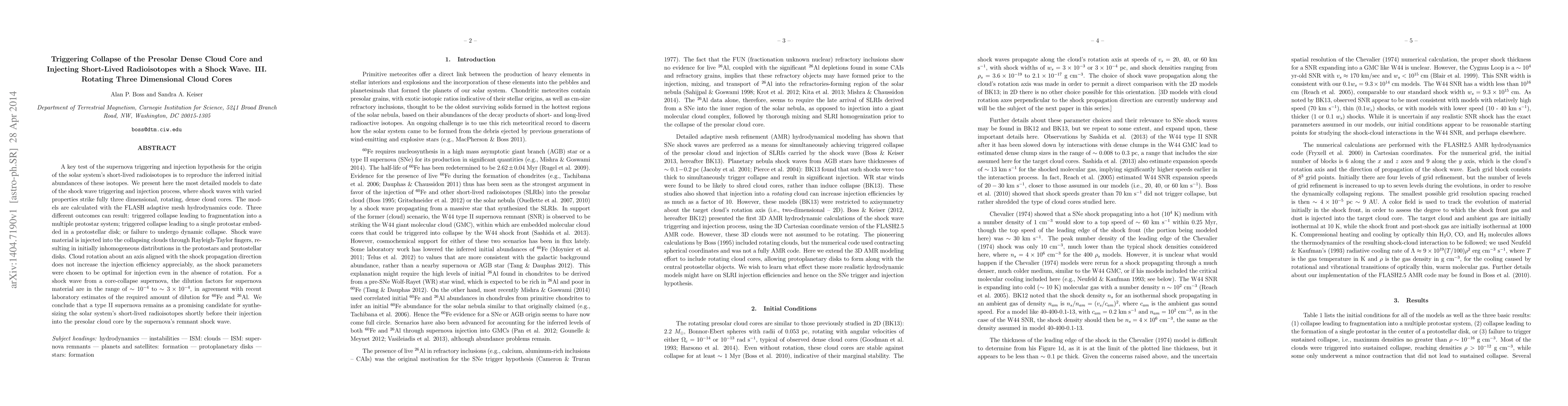 A key test of the supernova triggering and injection hypothesis for the origin of the solar system's short-lived radioisotopes is to reproduce the inferred initial abundances of these isotopes. We present here the most detailed models to date of the shock wave triggering and injection process, where shock waves with varied properties strike fully three dimensional, rotating, dense cloud cores. The models are calculated with the FLASH adaptive mesh hydrodynamics code. Three different outcomes can result: triggered collapse leading to fragmentation into a multiple protostar system; triggered collapse leading to a single protostar embedded in a protostellar disk; or failure to undergo dynamic collapse. Shock wave material is injected into the collapsing clouds through Rayleigh-Taylor fingers, resulting in initially inhomogeneous distributions in the protostars and protostellar disks. Cloud rotation about an axis aligned with the shock propagation direction does not increase the injection efficiency appreciably, as the shock parameters were chosen to be optimal for injection even in the absence of rotation. For a shock wave from a core-collapse supernova, the dilution factors for supernova material are in the range of $\sim 10^{-4}$ to $\sim 3 \times 10^{-4}$, in agreement with recent laboratory estimates of the required amount of dilution for $^{60}$Fe and $^{26}$Al. We conclude that a type II supernova remains as a promising candidate for synthesizing the solar system's short-lived radioisotopes shortly before their injection into the presolar cloud core by the supernova's remnant shock wave.
