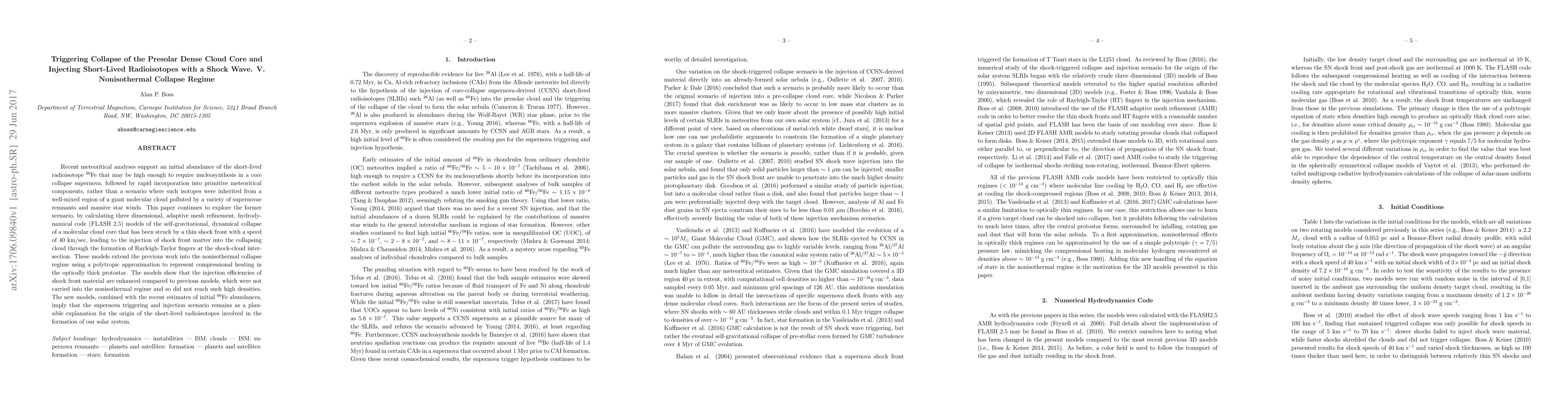 Recent meteoritical analyses support an initial abundance of the short-lived radioisotope $^{60}$Fe that may be high enough to require nucleosynthesis in a core collapse supernova, followed by rapid incorporation into primitive meteoritical components, rather than a scenario where such isotopes were inherited from a well-mixed region of a giant molecular cloud polluted by a variety of supernovae remnants and massive star winds. This paper continues to explore the former scenario, by calculating three dimensional, adaptive mesh refinement, hydrodynamical code (FLASH 2.5) models of the self-gravitational, dynamical collapse of a molecular cloud core that has been struck by a thin shock front with a speed of 40 km/sec, leading to the injection of shock front matter into the collapsing cloud through the formation of Rayleigh-Taylor fingers at the shock-cloud intersection. These models extend the previous work into the nonisothermal collapse regime using a polytropic approximation to represent compressional heating in the optically thick protostar. The models show that the injection efficiencies of shock front material are enhanced compared to previous models, which were not carried into the nonisothermal regime and so did not reach such high densities. The new models, combined with the recent estimates of initial $^{60}$Fe abundances, imply that the supernova triggering and injection scenario remains as a plausible explanation for the origin of the short-lived radioisotopes involved in the formation of our solar system.