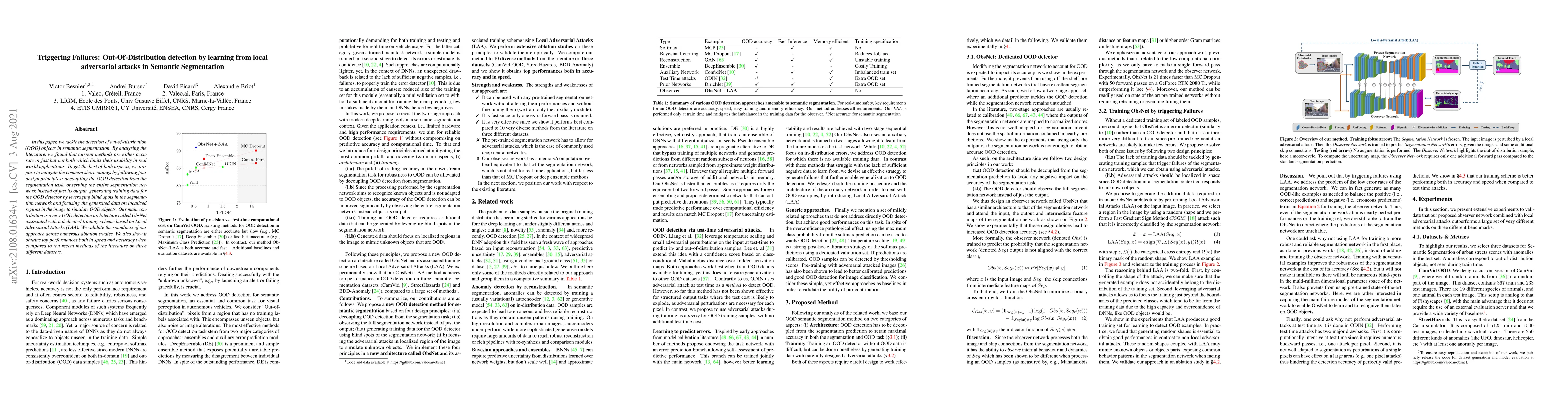 This paper proposes a new OOD detection architecture called ObsNet that combines speed and accuracy in semantic segmentation, outperforming 10 recent methods on three datasets.