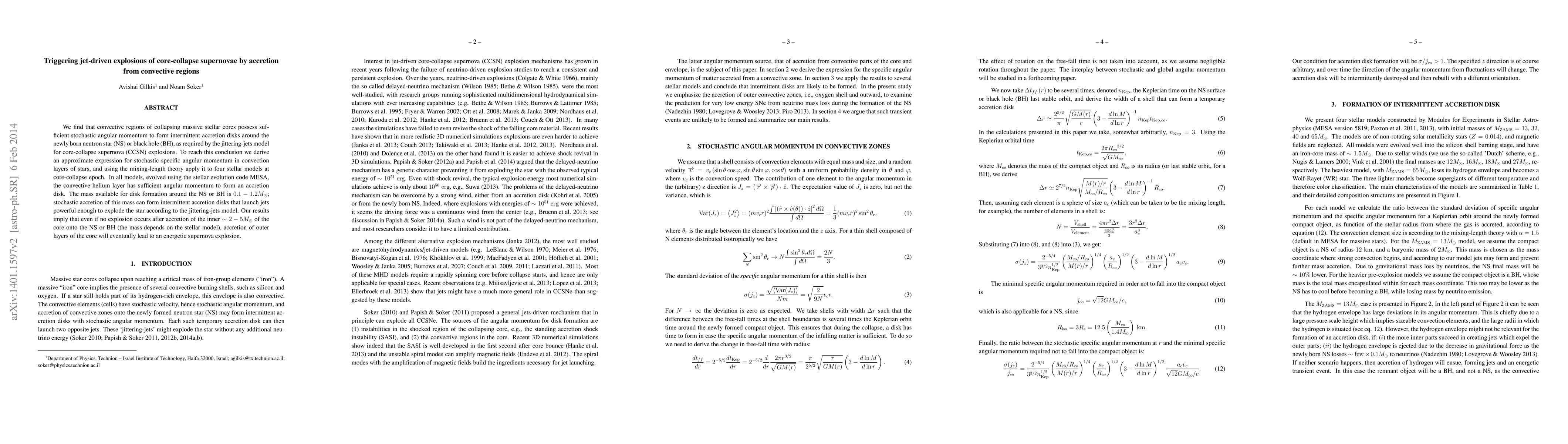 This paper demonstrates that convective regions in collapsing massive stellar cores can generate sufficient stochastic angular momentum to form accretion disks around newly formed neutron stars or black holes, supporting the jittering-jets model for core-collapse supernova explosions. The study finds that the convective helium layer has enough angular momentum to create these disks, which can subsequently launch jets powerful enough to trigger supernovae.