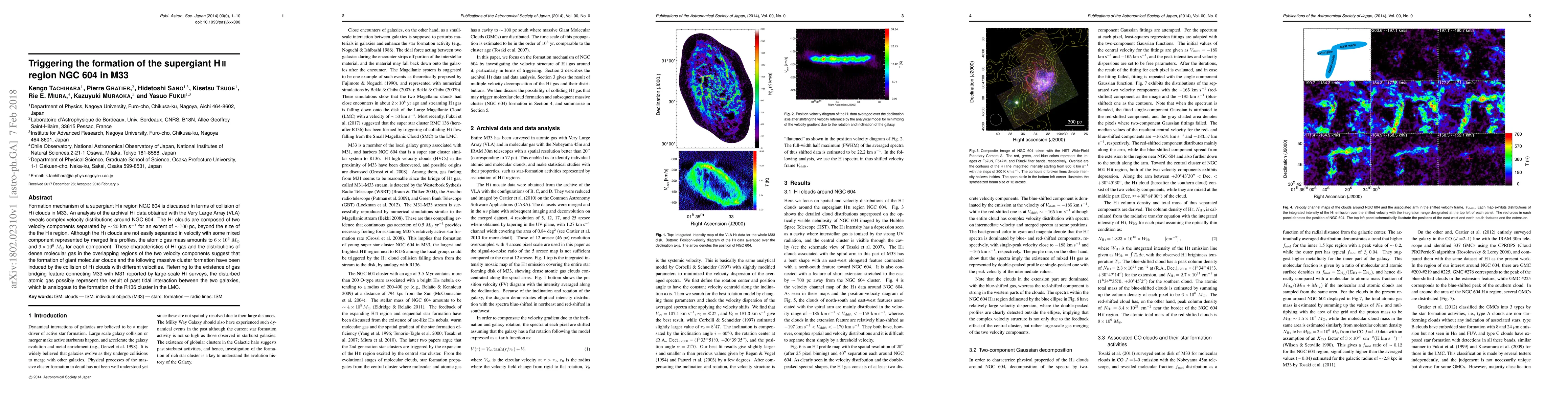 This paper investigates the formation of the supergiant H II region NGC 604 in M33, attributing its development to the collision of H I clouds with complex velocity distributions. The analysis suggests that the interaction of these clouds has induced the formation of giant molecular clouds and massive star clusters.