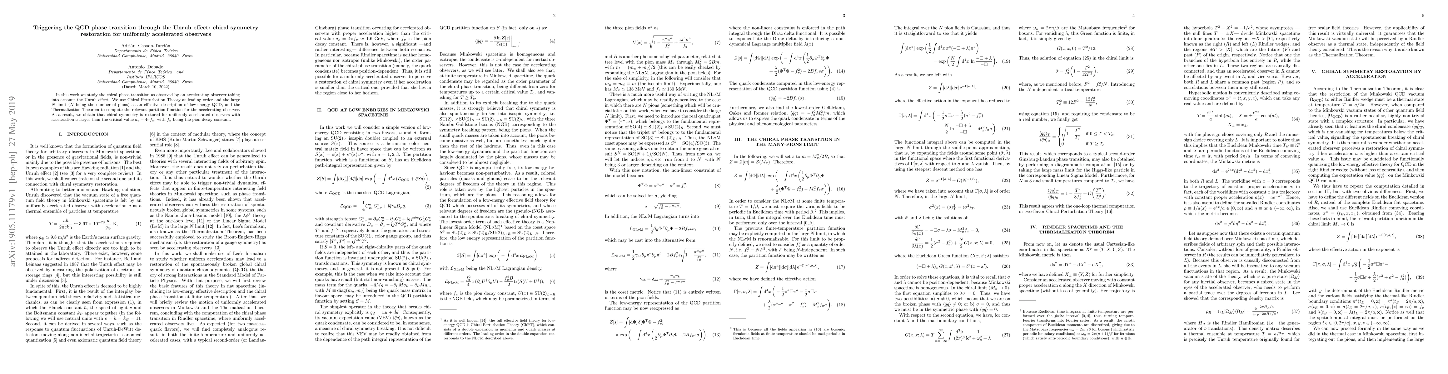This research investigates the chiral phase transition observed by uniformly accelerated observers, revealing that chiral symmetry is restored when acceleration exceeds the critical value $a_c=4\pi f_\pi$, using Chiral Perturbation Theory and the Unruh effect. The study employs the large $N$ limit and the Thermalization Theorem for calculations.