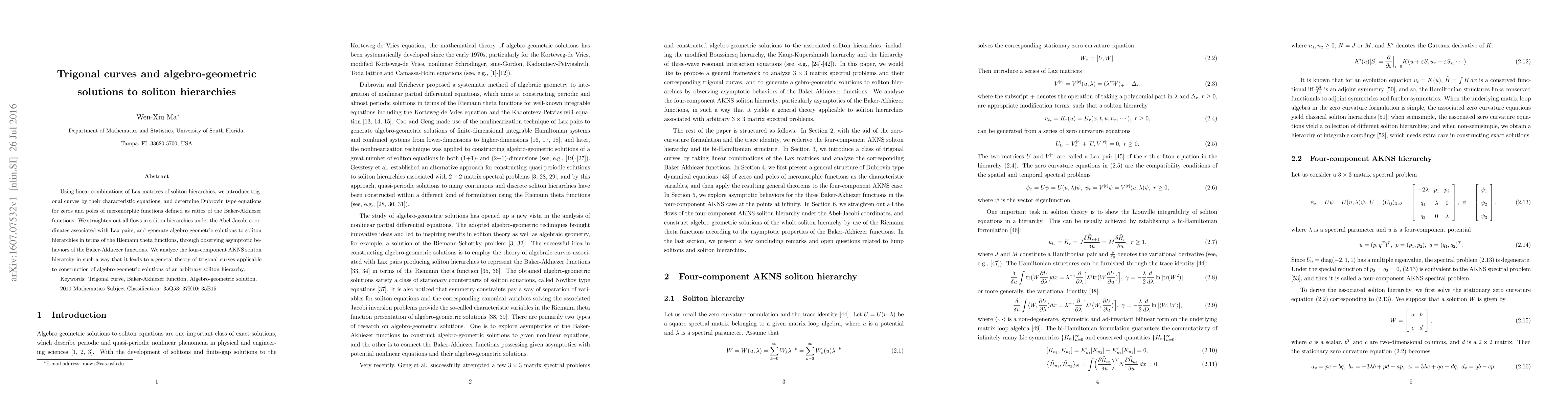 This paper introduces trigonal curves via characteristic equations derived from Lax matrices of soliton hierarchies and determines Dubrovin type equations for meromorphic functions. It generates algebro-geometric solutions using Riemann theta functions and analyzes the four-component AKNS hierarchy to develop a general theory for constructing solutions for any soliton hierarchy.
